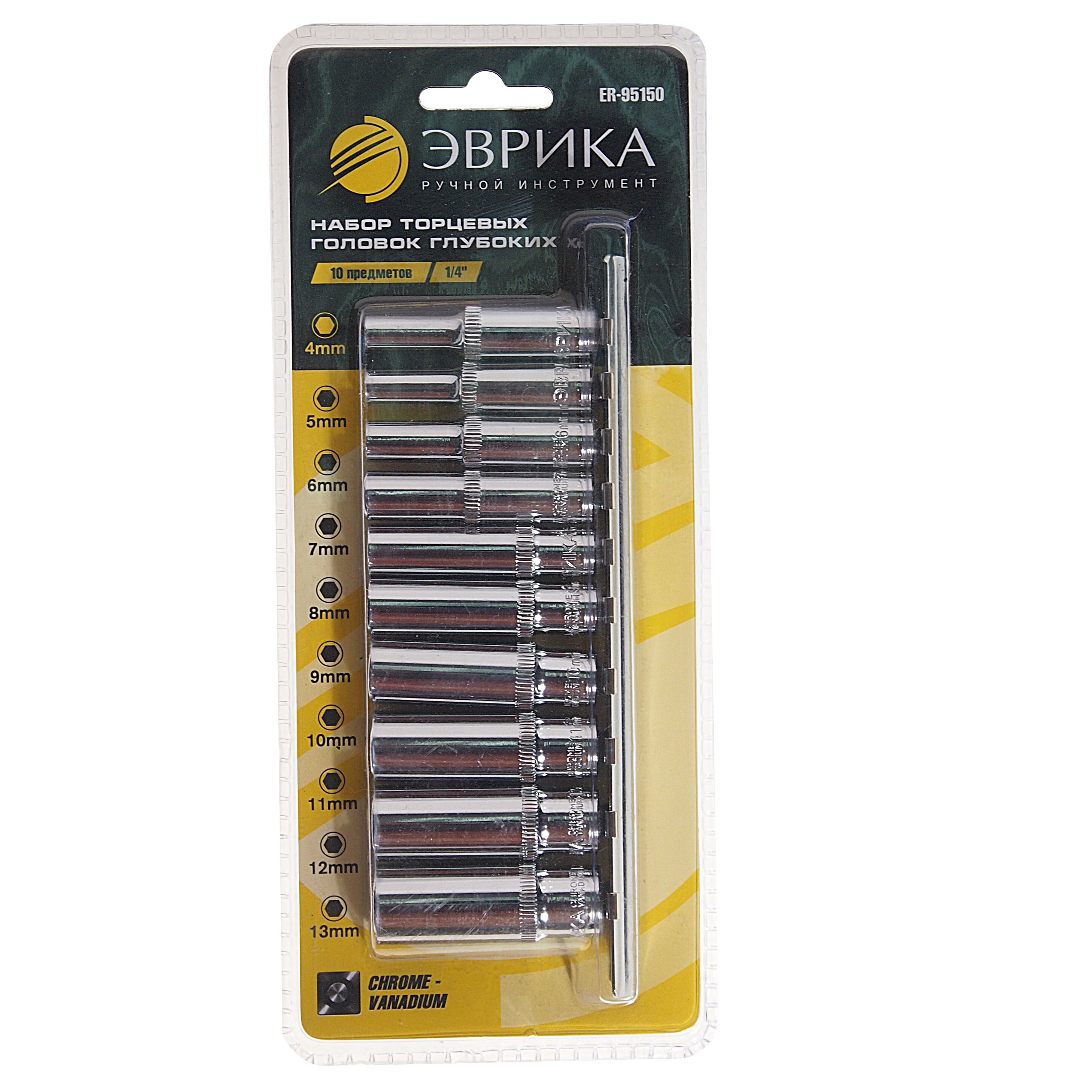 Набор глубоких торцевых головок(10 пр; 1/4 DR; 4-13 мм) ЭВРИКА ER-95150 предназначен для шуруповертов и гайковертов.