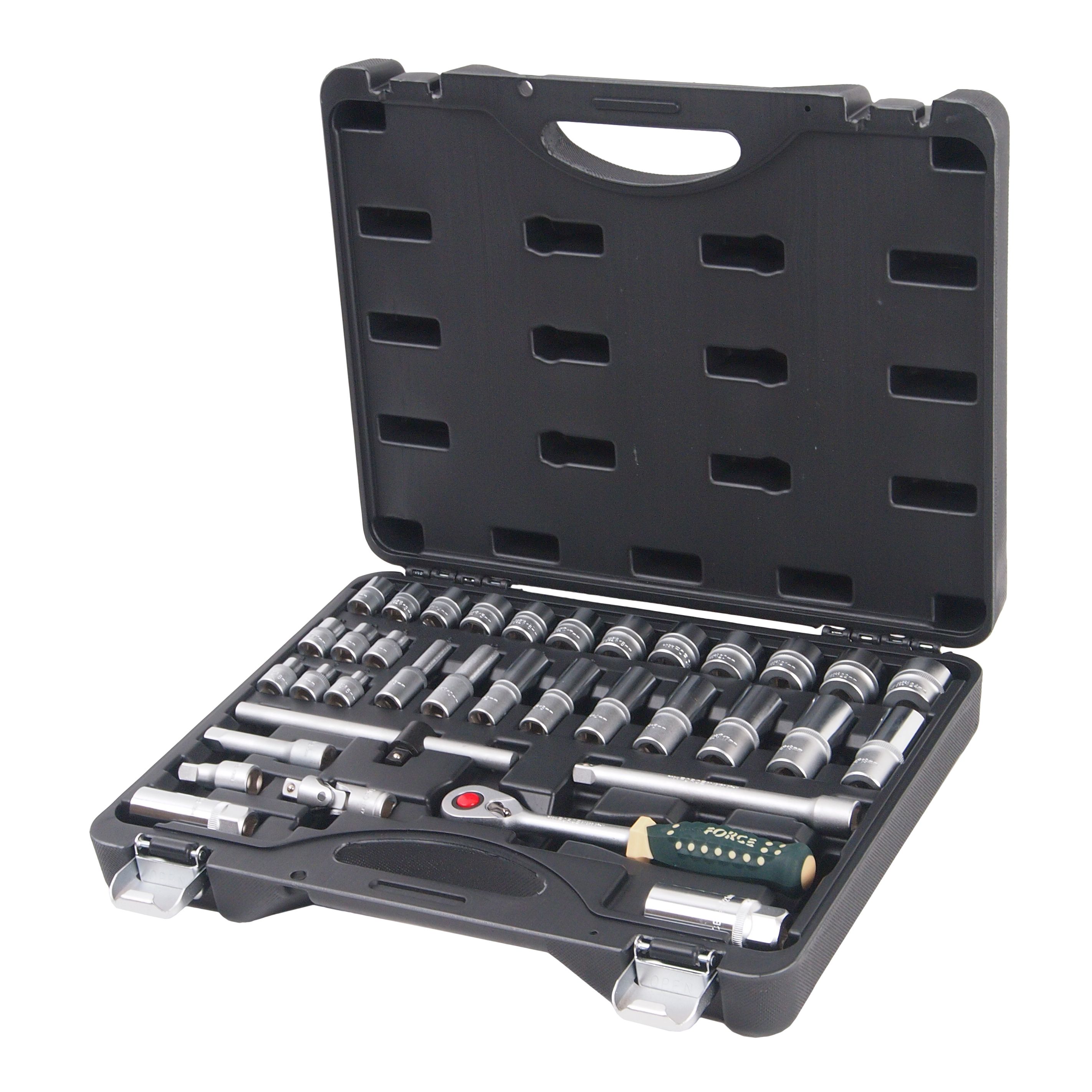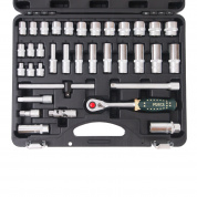 Посадочный квадрат 3/8". Тип головок: 6-гранные, короткие, глубокие. Комплектация: головоки 3/8"короткие 28 мм: 6, 7, 8, 9, 10, 11, 12, 13, 14, 15, 16,17, 18, 19, 20, 21, 22, 24 мм; головки 3/8"глубокие 60 мм: 8, 10, 12, 13, 14, 15, 17, 18, 19 мм; головки свечные 3/8": 16, 21 мм; трещотка 3/8"; вороток 3/8"Т-образный 165 мм; удлинители 3/8": 50, 75, 150 мм; кардан шарнирный 3/8". В пластиковом кейсе с металлическими защелками