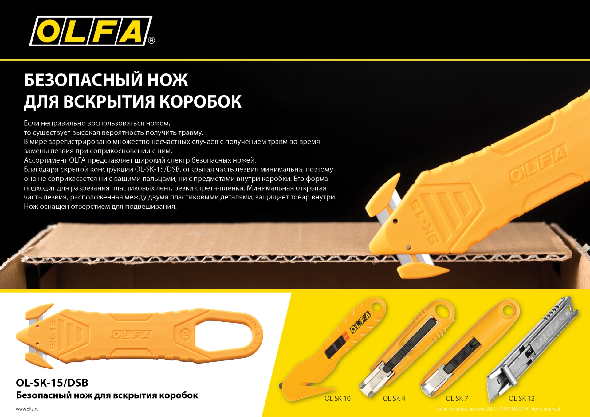 OLFA SK-15/DSB— это удобный и безопасный нож для разрезания упаковки. Благодаря продуманной конструкции открытая часть лезвия из нержавеющей стали минимальна, что предотвращает контакт режущего элемента с пальцами или предметами внутри коробки. Для еще большей безопасности вверху инструмента расположен разрезатель скотча.