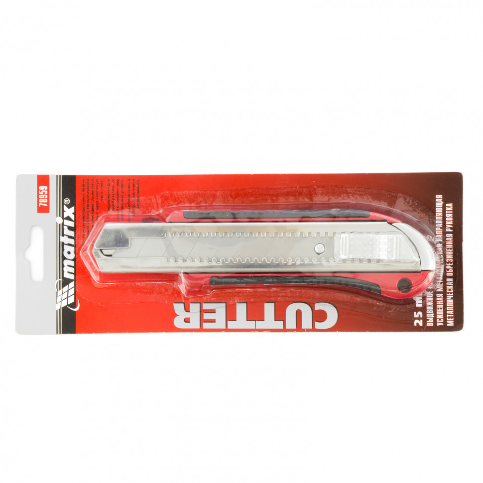 Нож Matrix 78959 с выдвижным лезвием шириной 25 мм, усиленной металлической направляющей и металлической обрезиненной ручкой служит для резания бумаги, картона, линолеума, обоев и других материалов. Благодаря усиленной направляющей нож не сломается даже при значительных нагрузках. Предусмотрена возможность ручной замены износившегося лезвия. Инструмент используется для проведения строительных работ, также полезен в быту. Преимущества Прочность и долговечность — полотно изготовлено из стали 60 толщиной 0,7 мм. Высокий ресурс — полотно долго сохраняет режущую способность, затупившийся сегмент можно отломить, и нож снова будет готов к работе. Надежная конструкция — винтовой фиксатор удерживает лезвие в рабочем положении. Комфортная работа — двухкомпонентная рукоятка с рифленой поверхностью не выскальзывает из руки.