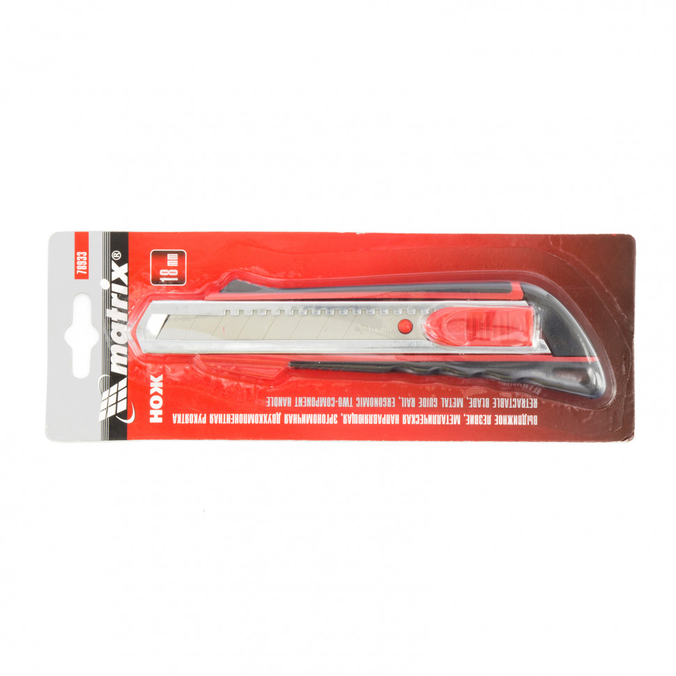 Нож Matrix 78933 с выдвижным лезвием шириной 18 мм, металлической направляющей и эргономичной двухкомпонентной рукояткой пригодится при выполнении ремонтных и строительных работ в мастерской и в быту. Он легко режет бумагу, картон, кожу, обои и другие материалы. Выдвижная конструкция позволяет с удобством эксплуатировать и безопасно перевозить нож.ПреимуществаПрочность и надежность лезвия обеспечивает сталь 60, из которой оно изготовлено.При необходимости лезвие легко меняется через хвостовую часть инструмента.Металлическая направляющая защищают корпус от повреждений даже при интенсивном использовании.На лезвие нанесены риски, поэтому при затуплении кромки достаточно отломать сегмент и продолжить использование ножа.