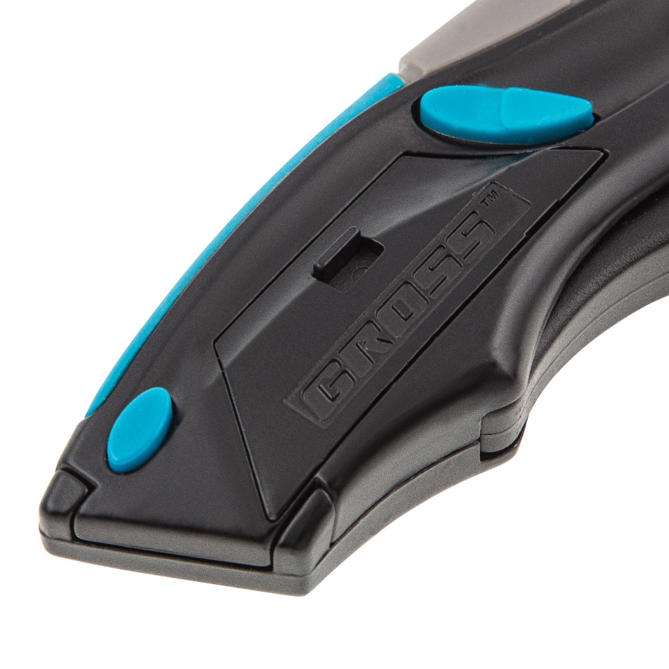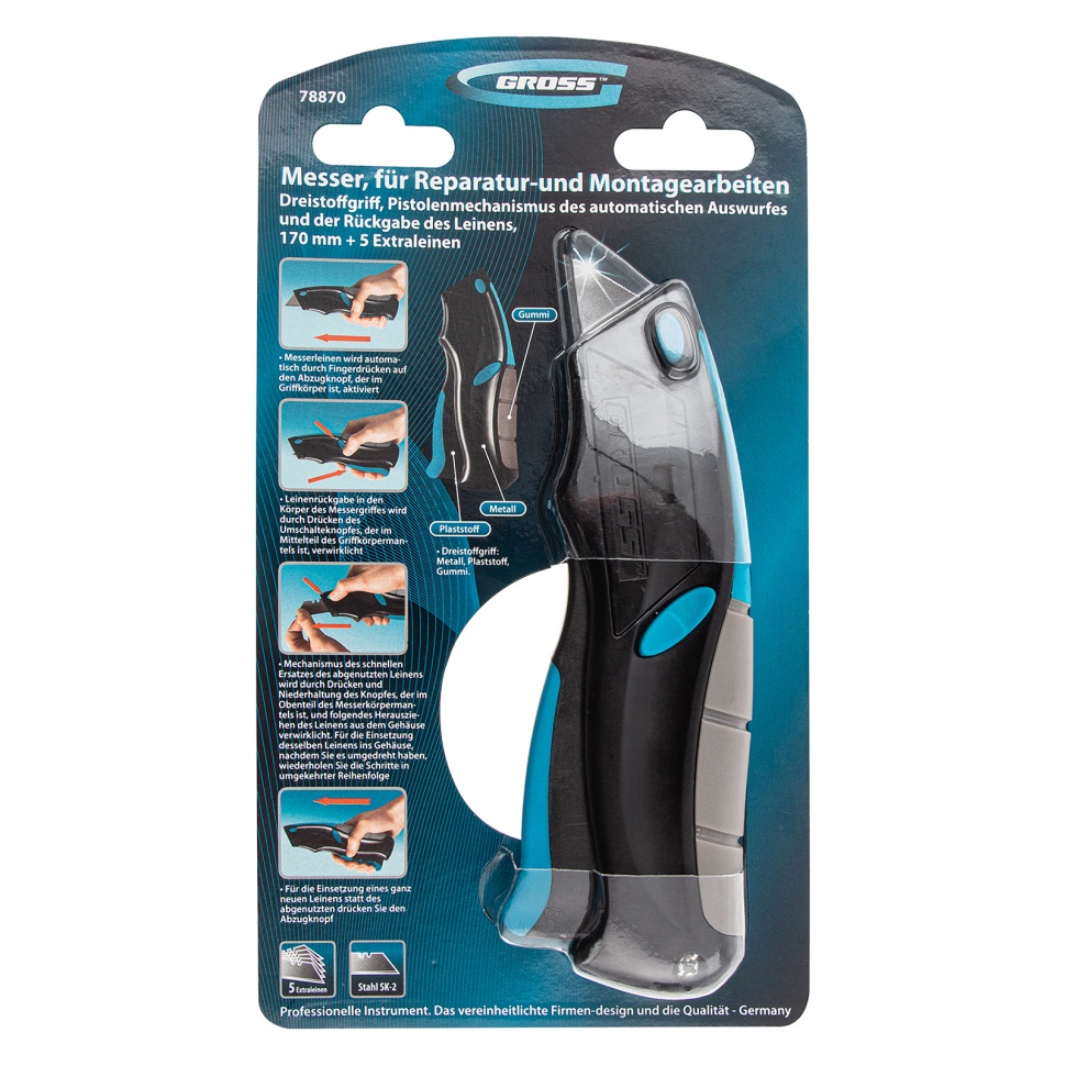 Ремонтно-монтажный нож пистолетного типа Gross 78870 длиной 170 мм, с трехкомпонентной рукояткой, автовыбросом/возвратом лезвия и 5 запасными лезвиями, применяется для разрезания линолеума, картона, кожи и других материалов. Лезвия изготовлены из высокопрочной японской стали SK-2, поэтому не ломаются и долго не тупятся. Инструмент предназначен для профессиональных работ, но может использоваться и в быту.ПреимуществаУдобное использование — полотно выдвигается при нажатии на курок и фиксируется в рабочем положении, а для его возврата нужно нажать на кнопку.Высокий ресурс — трапециевидное лезвие имеет режущие кромки с двух сторон, и для восстановления работоспособности достаточно его перевернуть.Прочность — трехкомпонентная рукоятка выдерживает механические нагрузки, поэтому нож подходит для частого использования.Быстрая и безопасная замена лезвия — изношенное полотно извлекается одним нажатием на специальную кнопку.Расходники в комплекте — к ножу прилагается 5 запасных полотен, которых хватит надолго.Продуманное хранение расходников — сменные полотна размещаются в отсеке внутри корпуса, поэтому они не потеряются и всегда будут под рукой.