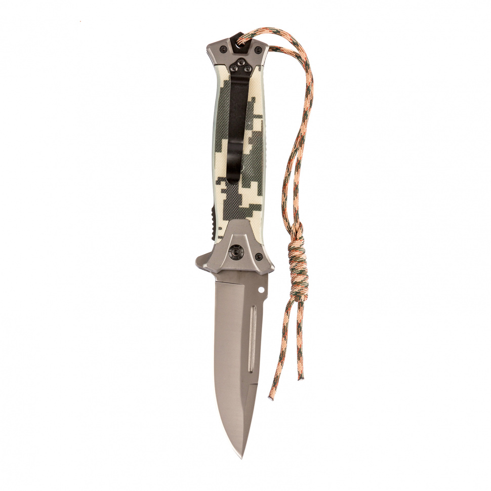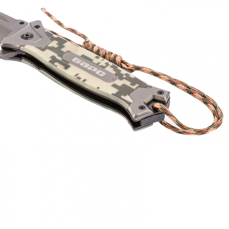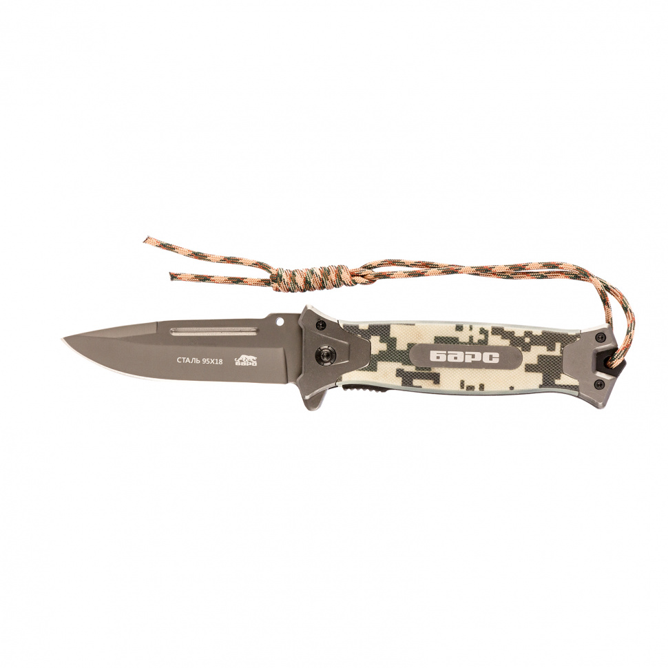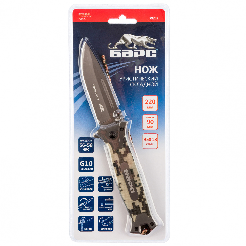 Складной туристический нож Барс 79202, 220мм/90мм, с системой Liner-Lock, накладкой G10 на рукоятке и стеклобоем, находит широкое применение при активном отдыхе на природе, на рыбалке и охоте. Встроенный механизм Liner-Lock позволяет быстро раскрывать нож одной рукой. А также нож оснащен стеклобоем, которым можно разбить стекло в аварийной ситуации.ПреимуществаВысокий ресурс и коррозионная стойкость — лезвие ножа выполнено из стали 95Х18 твердостью 56-58 HRC с титановым покрытием.Безопасность эксплуатации — двусторонний упор и рукоятка с многослойной накладкой G10 из стеклотекстолита предотвращают соскальзывание руки на лезвие.Удобная транспортировка — нож оснащен клипсой для фиксации на ремне и веревкой для закрепления на запястье.