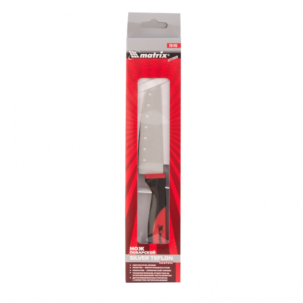 Поварской нож Matrix KITCHEN «Silver Teflon» medium 79145, 120 мм, с тефлоновым покрытием полотна и двухкомпонентной рукояткой, применяется для нарезания всех видов продуктов — сыра, колбасы, ветчины и других закусок, а также мяса, птицы, рыбы, овощей, фруктов и зелени. На полотне имеются технологические отверстия, благодаря которым продукты не прилипают к клинку. Нож пригодится на каждой кухне.ПреимуществаКлинок из хирургической нержавеющей стали обладает высоким рабочим ресурсом.Высокопрочное и износостойкое серебристое тефлоновое покрытие характеризуется минимальным коэффициентом трения, что исключает налипание кусочков продуктов на полотно.Эргономичная рукоятка с антискользящим покрытием делает облегчает процесс нарезания продуктов.Защитный протектор препятствует соскальзыванию пальцев на лезвие, обеспечивая безопасность во время работы.