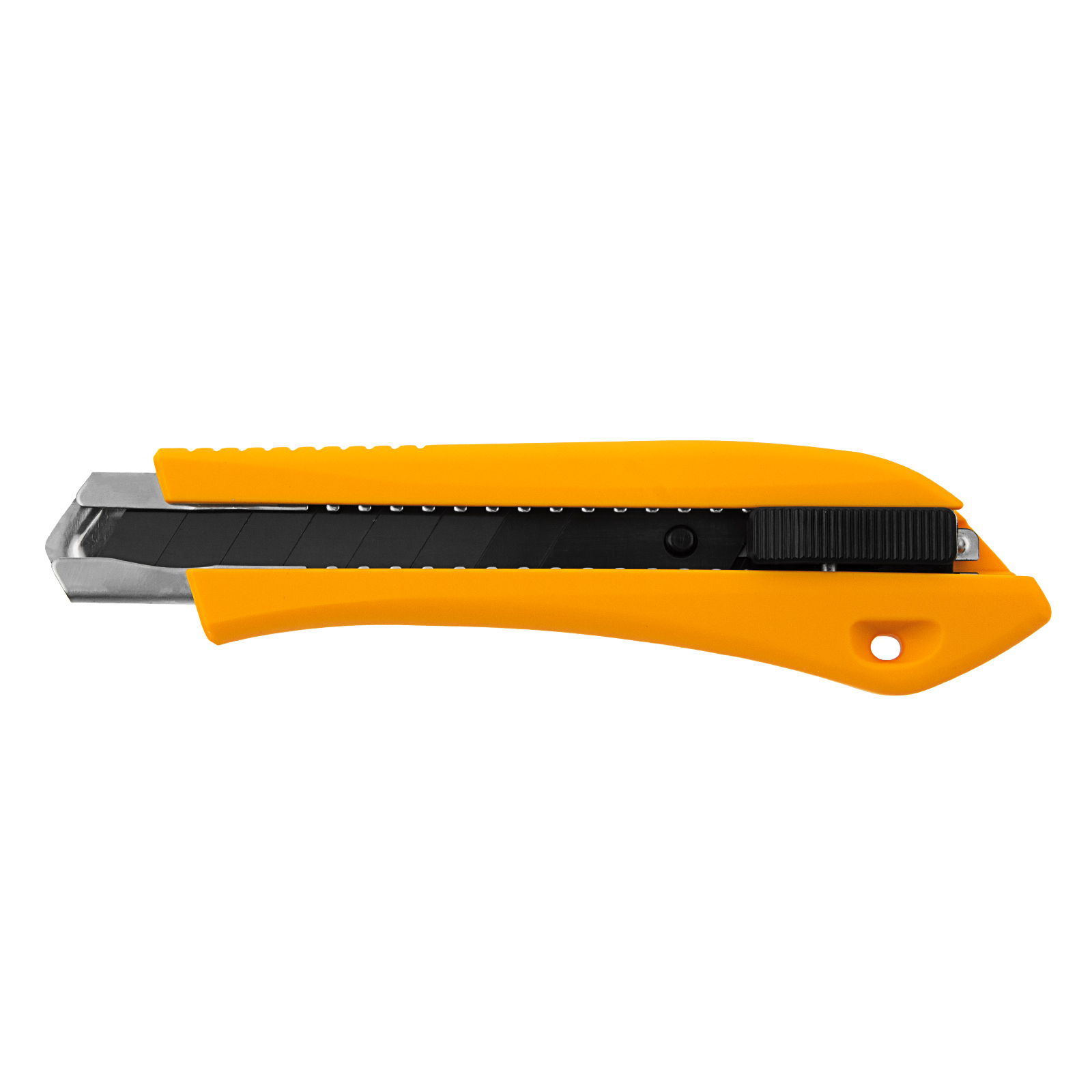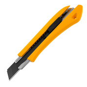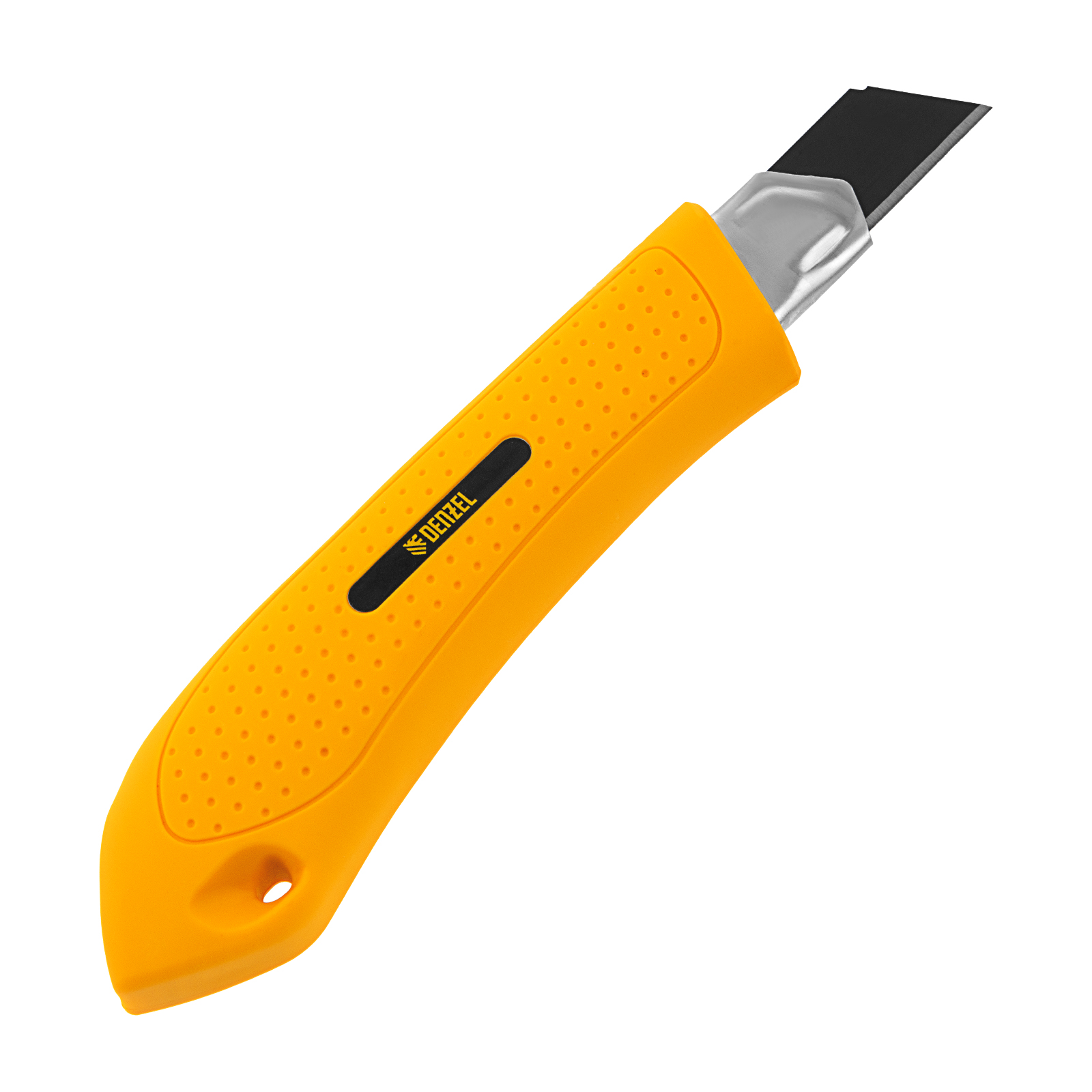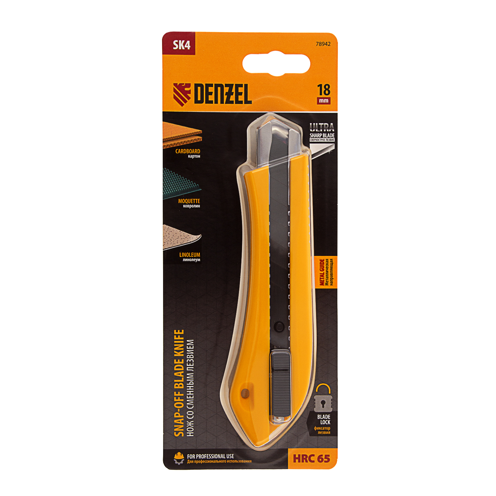 Нож Denzel 78942 с выдвижным лезвием шириной 18 мм предназначен для резки линолеума, ковролина, бумаги, обоев, картона и других листовых материалов. Лезвие ножа изготовлено из высокоуглеродистой инструментальной японской стали SK-4, твердость режущей кромки- 65 HRC. Смена сегмента лезвия производится путем обламывания по линии насечки. Исползуйте шарнирно-губцевый инструмент, направляя нож в безопасную от себя сторону. При обламывании необходимо одевать средства индивидуальной защиты-очки, перчатки.