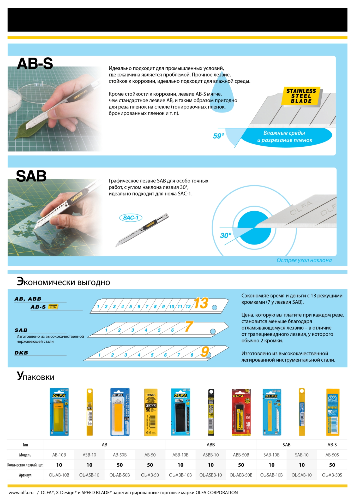 Используются в качестве сменных рабочих элементов в ножах OLFA SAC-1. Применяются для резки картона, бумаги, гибкой пластмассы, пленки, обоев.