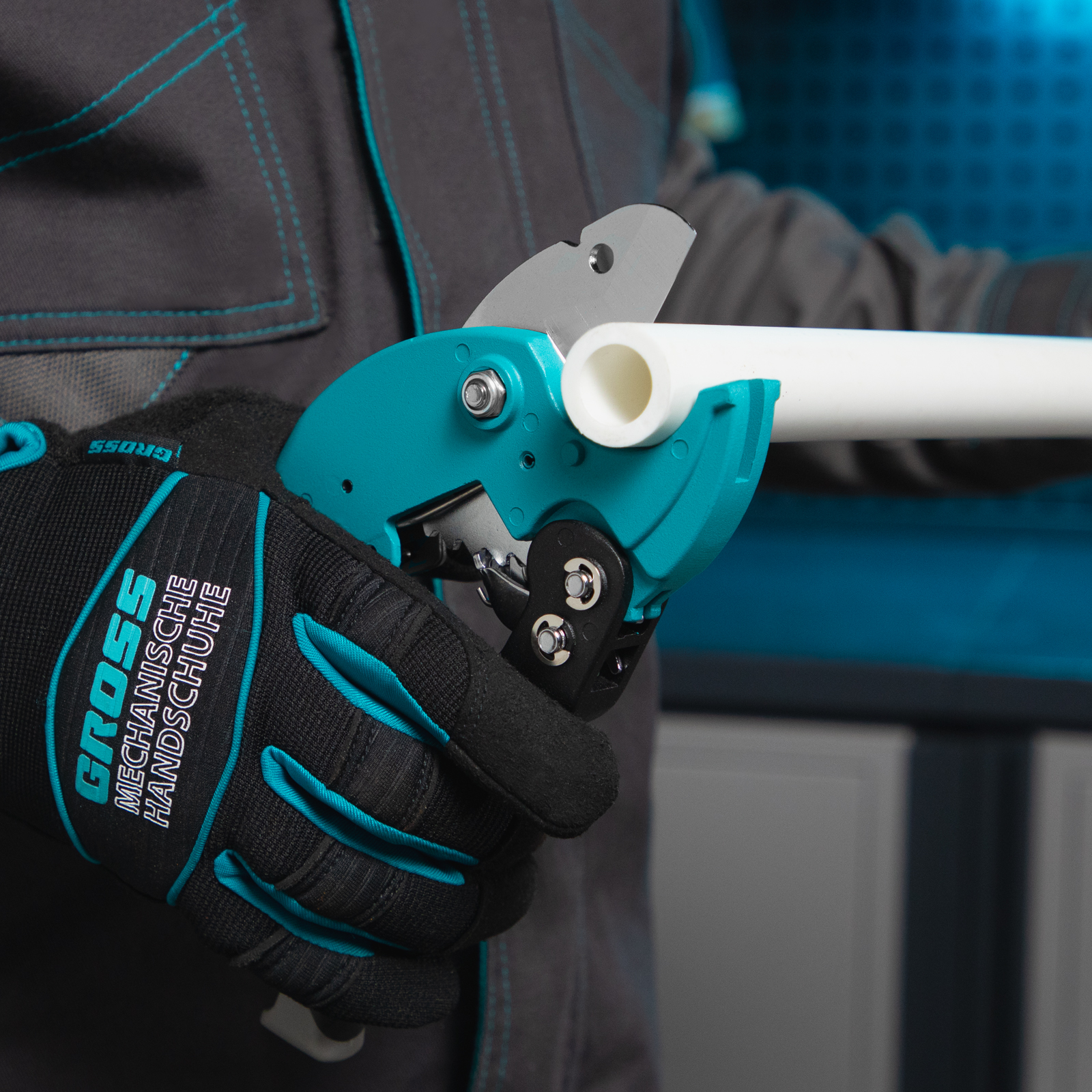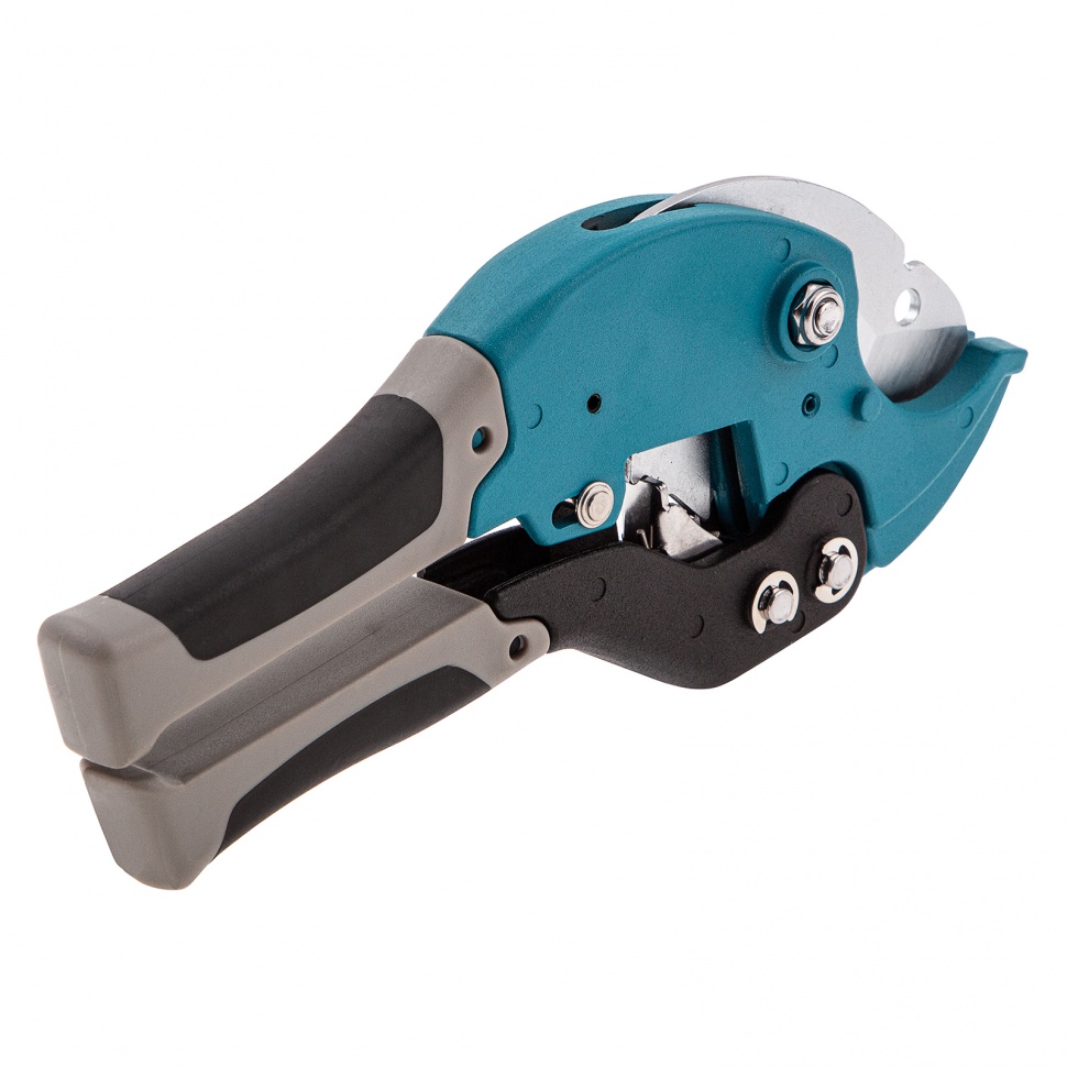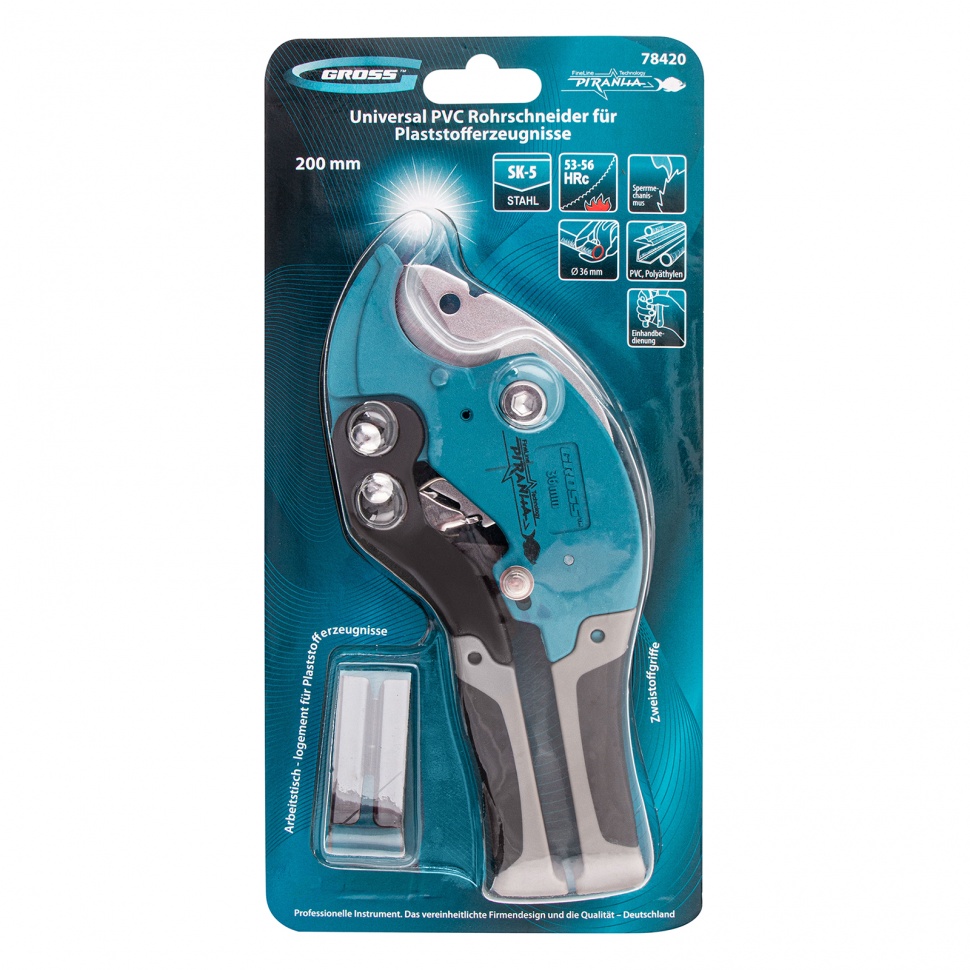 Ножницы для резки изделий из ПВХ Gross 78420 с двухкомпонентными рукоятками и рабочим столиком используются для разрезания резиновых шлангов и пластиковых заготовок диаметром до 36 мм — труб, плинтусов, профилей, галтелей, планок, реек. Трапециевидное полотно с двумя рабочими кромками обеспечивает высокую производительность инструмента. Стол, устанавливаемый на опорную поверхность ножниц, позволяет резать плоские предметы. Инструмент рекомендован для профессионального применения. Преимущества Рабочее полотно из высококачественной японской стали SK-5 прочное и износостойкое. Лезвие твердостью 53-56 HRC обладает высокой режущей способностью. Улучшенный 6-ступенчатый храповый механизм облегчает работу. Корпус с порошковым покрытием и никелированное лезвие устойчивы к коррозии. Эргономичные двухкомпонентные рукоятки удобно лежат в руке и не выскальзывают из ладони. Фиксатор удерживает рукоятки в сложенном положении для удобства хранения и транспортировки. Для корректной работы инструмента, чтобы предотвратить перекос лезвия относительно ПВХ-трубы, рекомендуется, чтобы отрезаемая часть была больше или равна внешнему диаметру ПВХ-трубы. В противном случае может возникнуть перекос лезвия, что также может привести к поломке лезвия/инструмента.