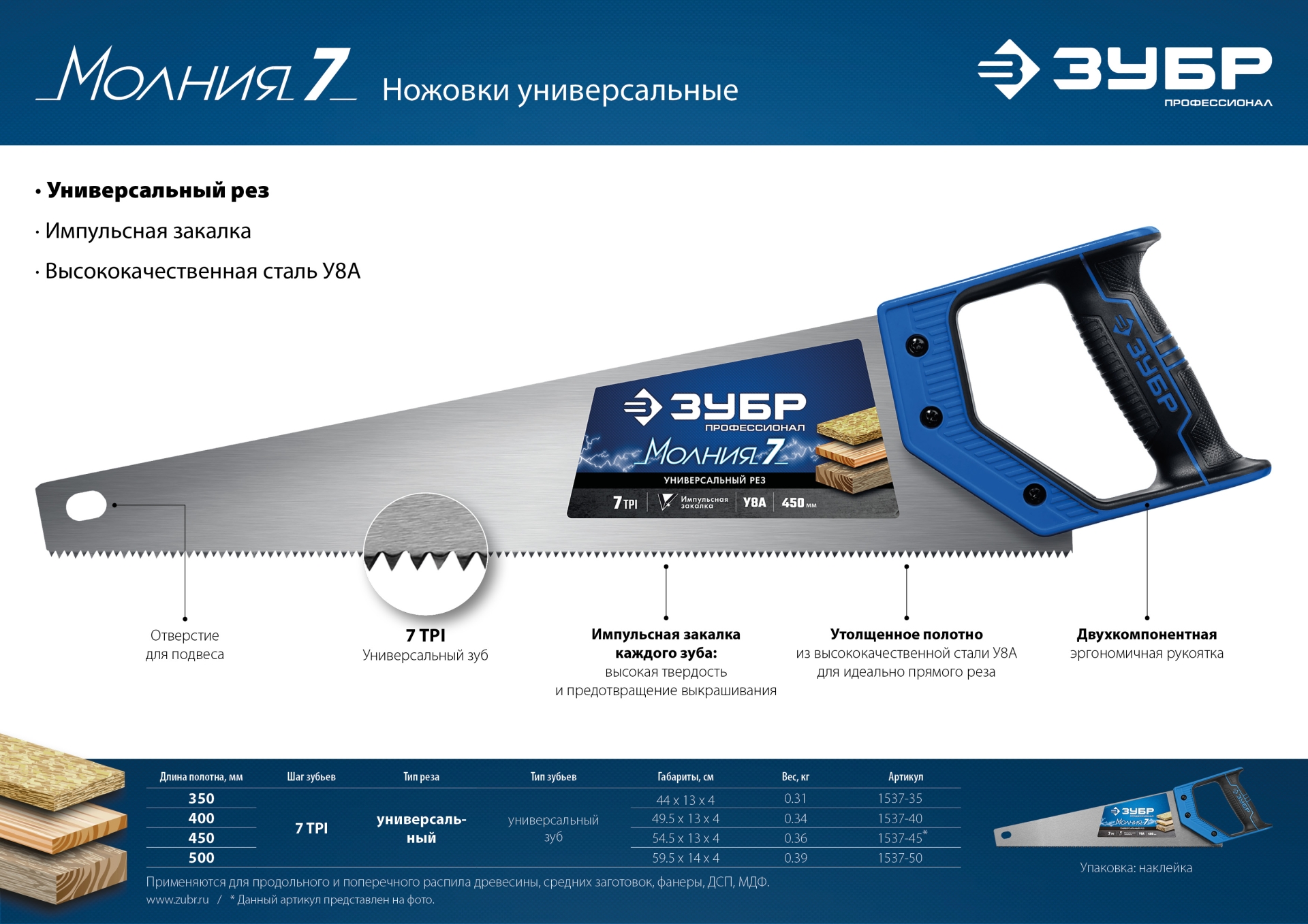 Надежный и качественный инструмент с крупными прямыми зубьями, остро заточенными с двух сторон, обеспечивает быстрый точный рез рез вдоль и поперек волокон, для средних заготовок, фанеры, ДСП, МДФ