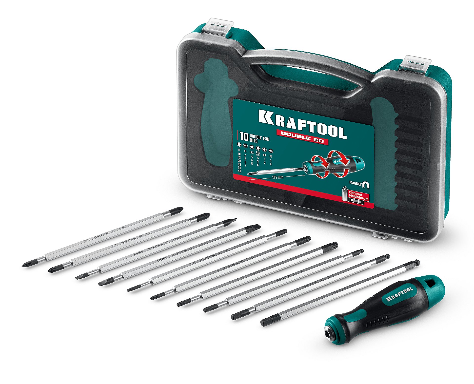Профессиональный набор KRAFTOOL с высокопрочными Cr-Mo стержнями. Переставная отвертка надежно удерживает стержни и позволяет применять максимальные усилия при работе