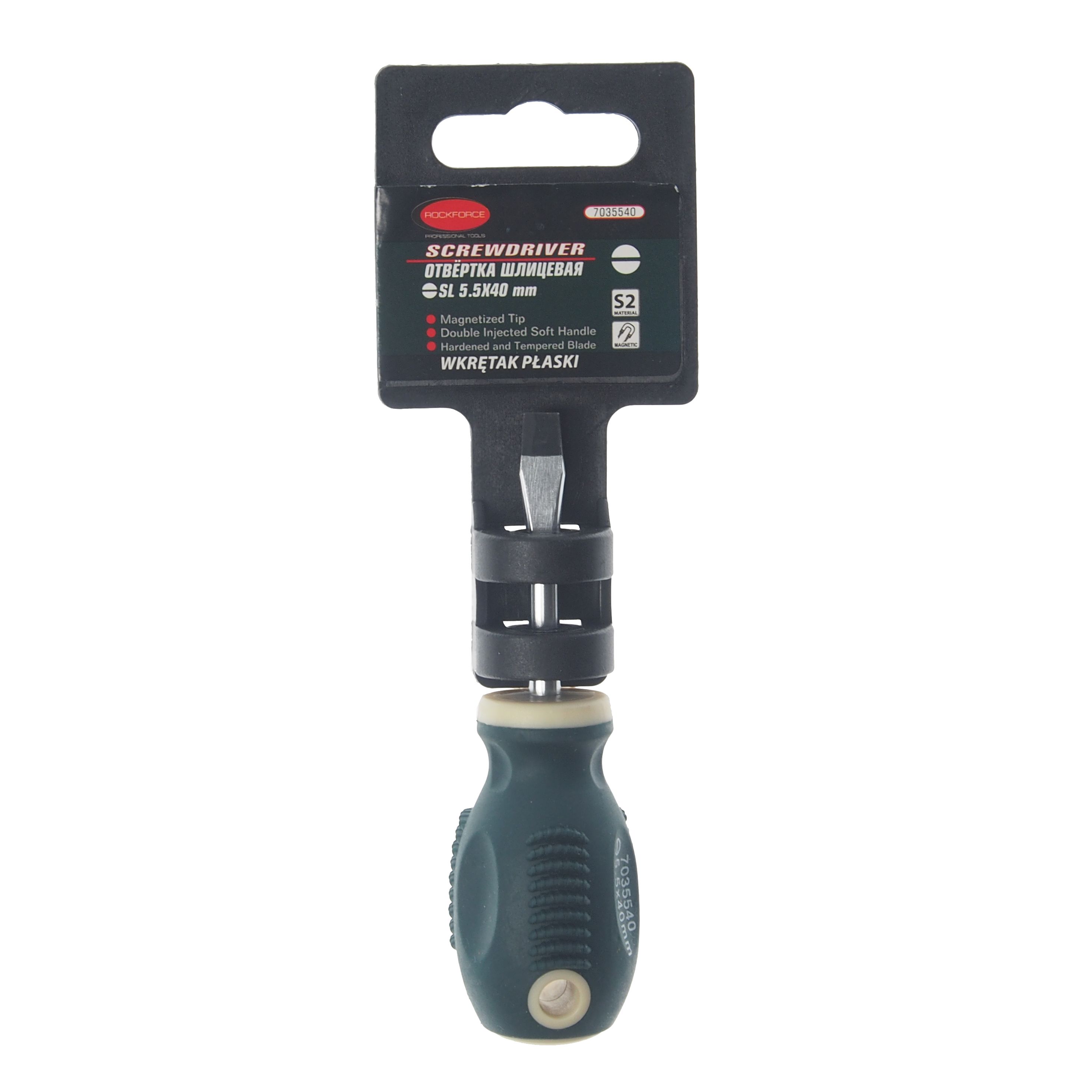 Отвертка шлицевая RockForce магнитная «Profi» S2 5.5×40мм, на пластиковом держателе Отвертка подойдет для мастеров всех профилей, и пригодиться даже в быту. Стержень отвертки выполнен из легированной стали. Рукоятка выполнена из мягкого полиуретана, с ней удобно работать, так же она устойчива к техническим жидкостям (масло и бензин).