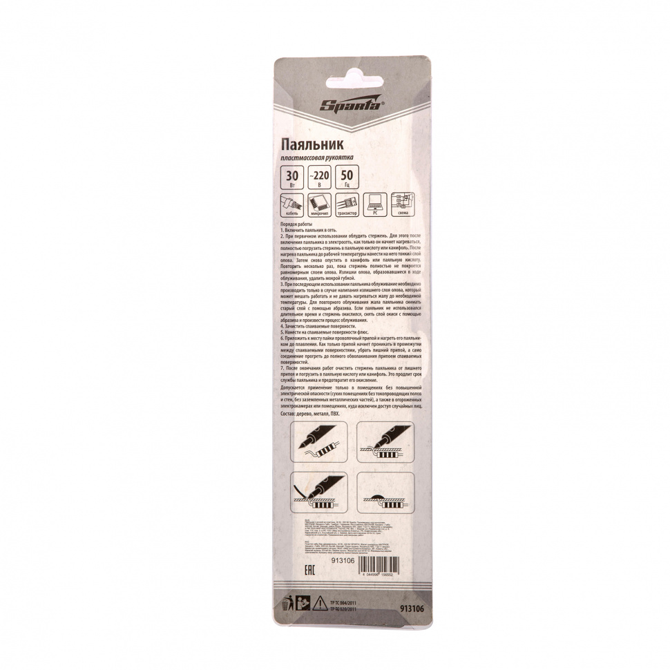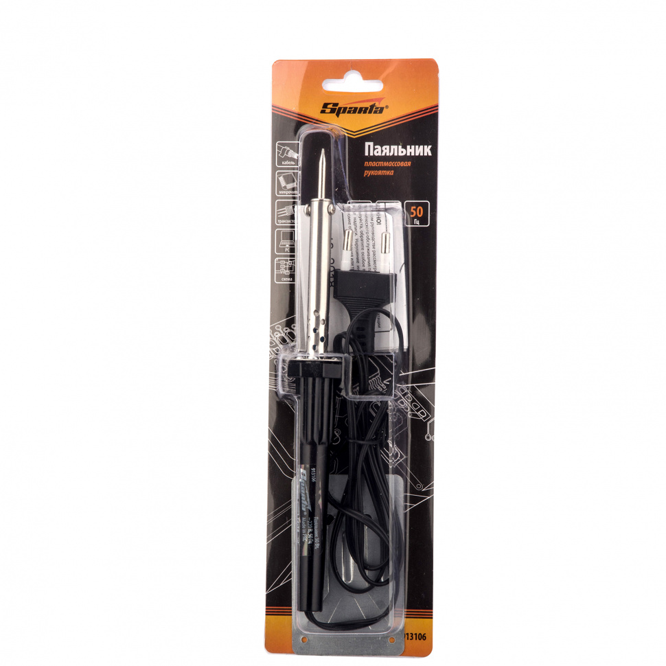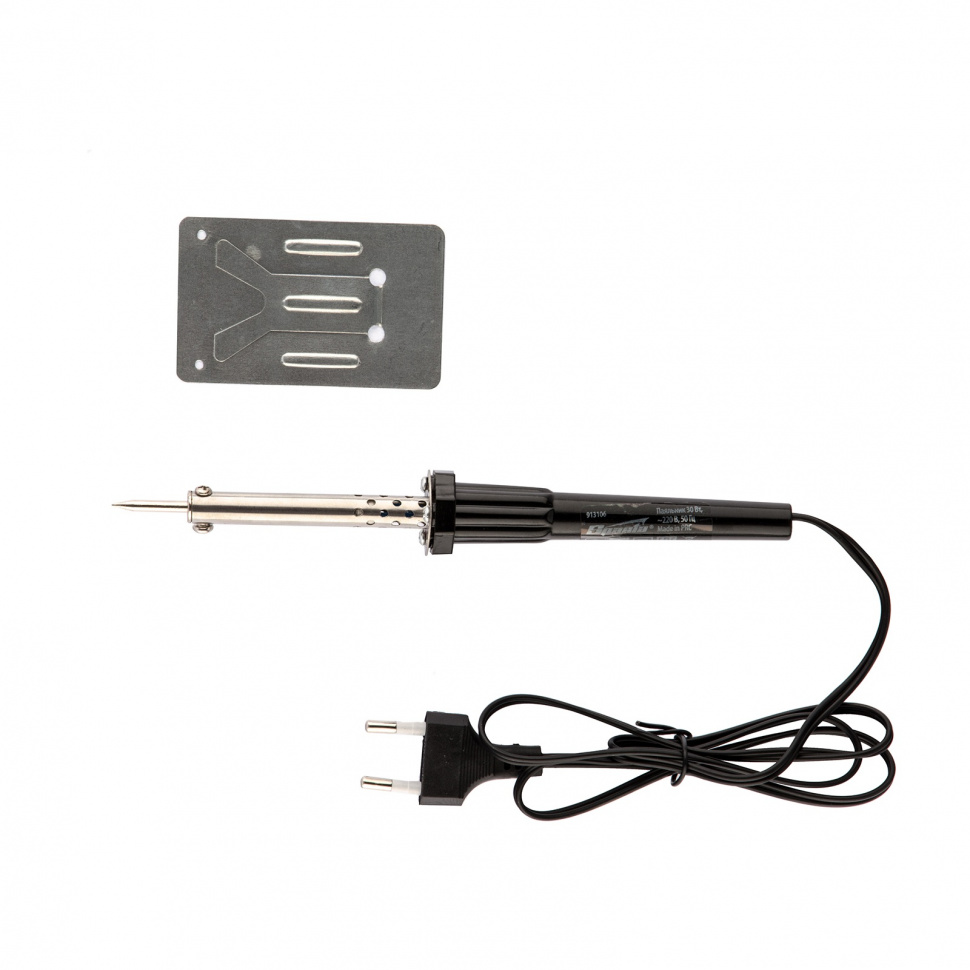 Паяльник Sparta 913106 мощностью 30 Вт, с пластиковой ручкой, работает от сети 220 В, предназначен для пайки микросхем, транзисторов, проводов и используется для ремонта электроники и бытовой техники. Нагревательным элементом является нихромовая спираль, что повышает устойчивость прибора к повреждениям в результате удара или падения. Съемное жало при необходимости можно заменить.ПреимуществаЭкономия времени на подготовку к работе и обслуживание— медное жало быстро разогревается и легко чистится.Комфорт во время работы — пластиковая рукоятка удобно лежит в руке.Безопасность — прибор комплектуется металлической подставкой, которая позволяет избежать обугливания столешницы при соприкосновении с разогретым жалом.