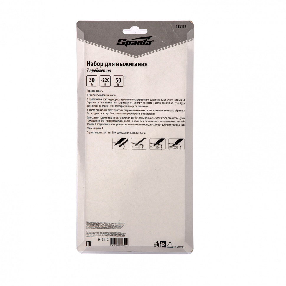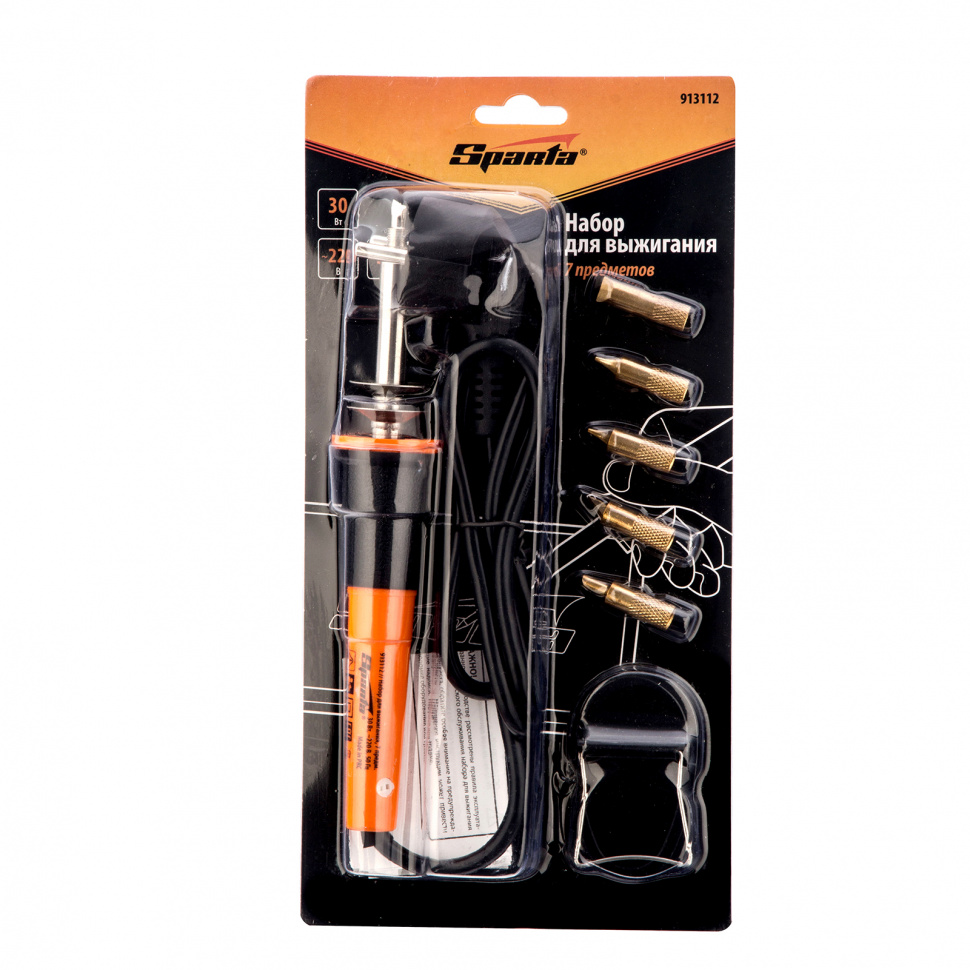 Набор для выжигания Sparta 913112 включает в себя все необходимое для создания изображений или орнаментов на деревянных заготовках — паяльник мощностью 30 Вт, подставку и сменные жала из латуни. Керамический нагреватель обеспечивает выжигателю стабильную работу и долговечность. Набор используется во время занятий творчеством.ПреимуществаФормирование линий необходимой ширины и глубины — в набор входит пять сменных жал разной формы.Безопасность — в набор входит подставка для размещения разогретого жала, позволяющая исключить повреждение столешницы.Комфортная работа — на пластиковой рукоятке паяльника имеется широкое резиновое кольцо, благодаря которому она не нагревается и не выскальзывает из ладони.