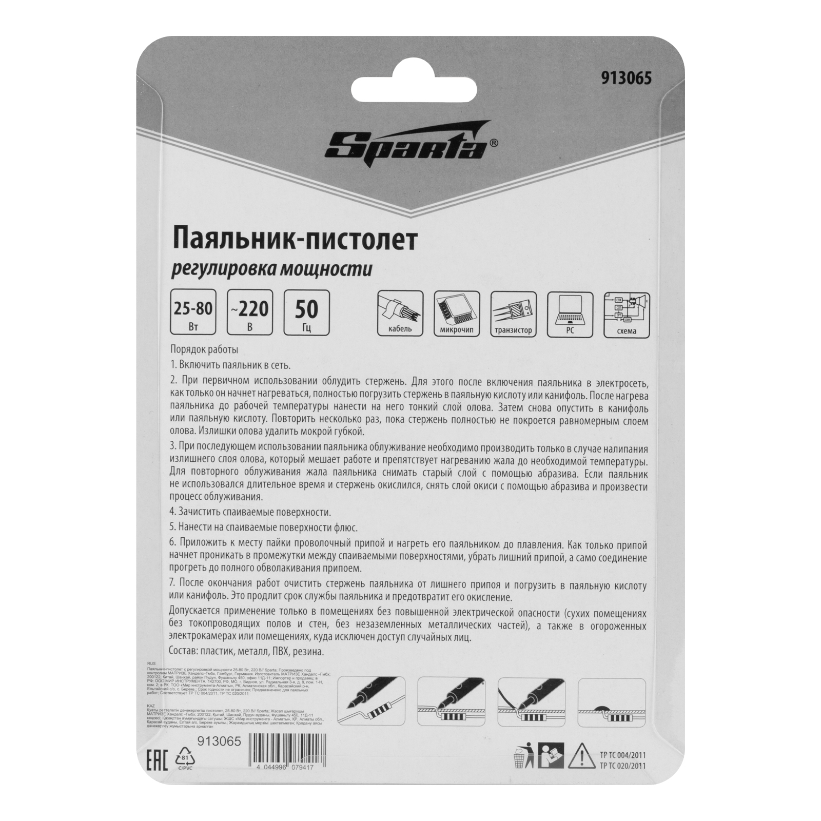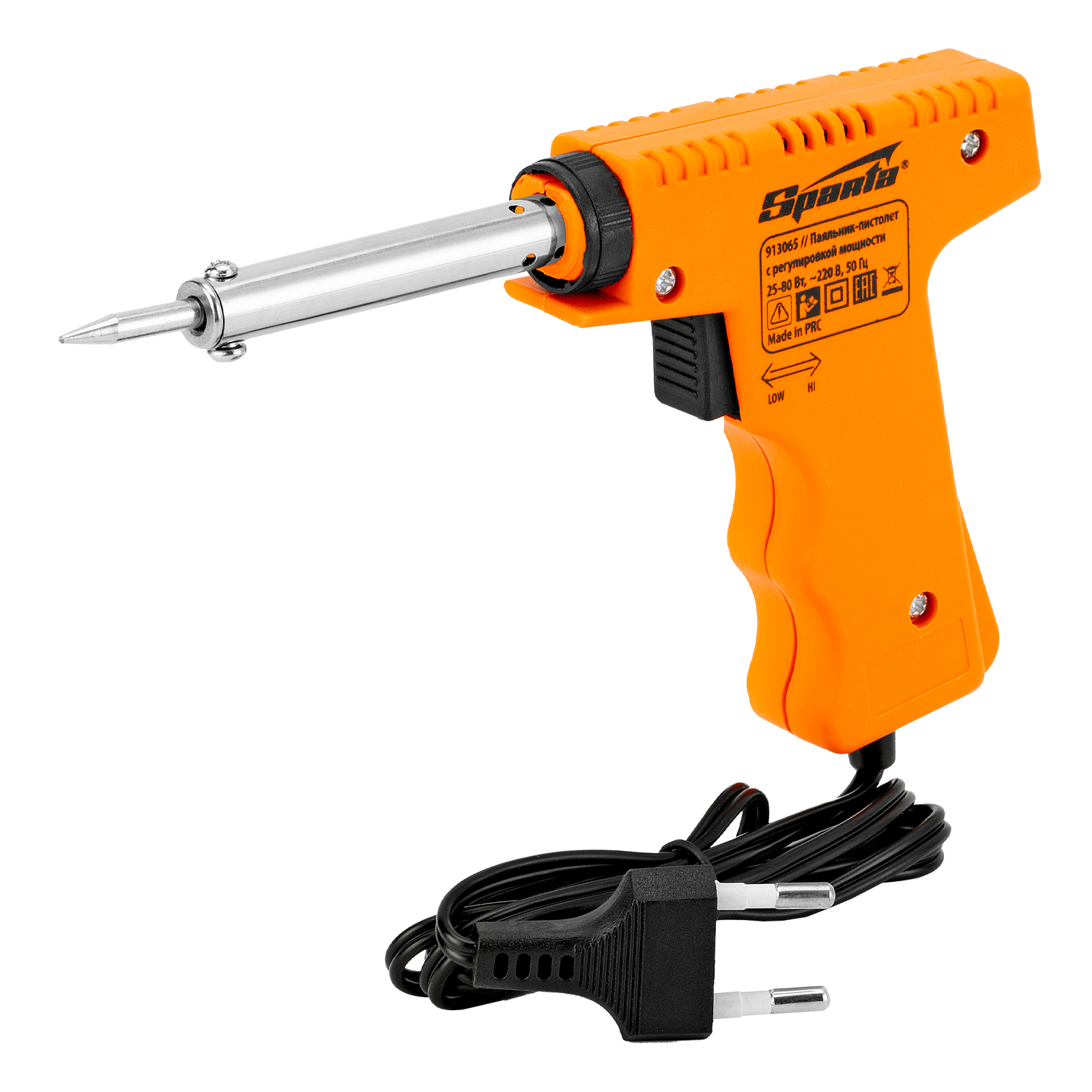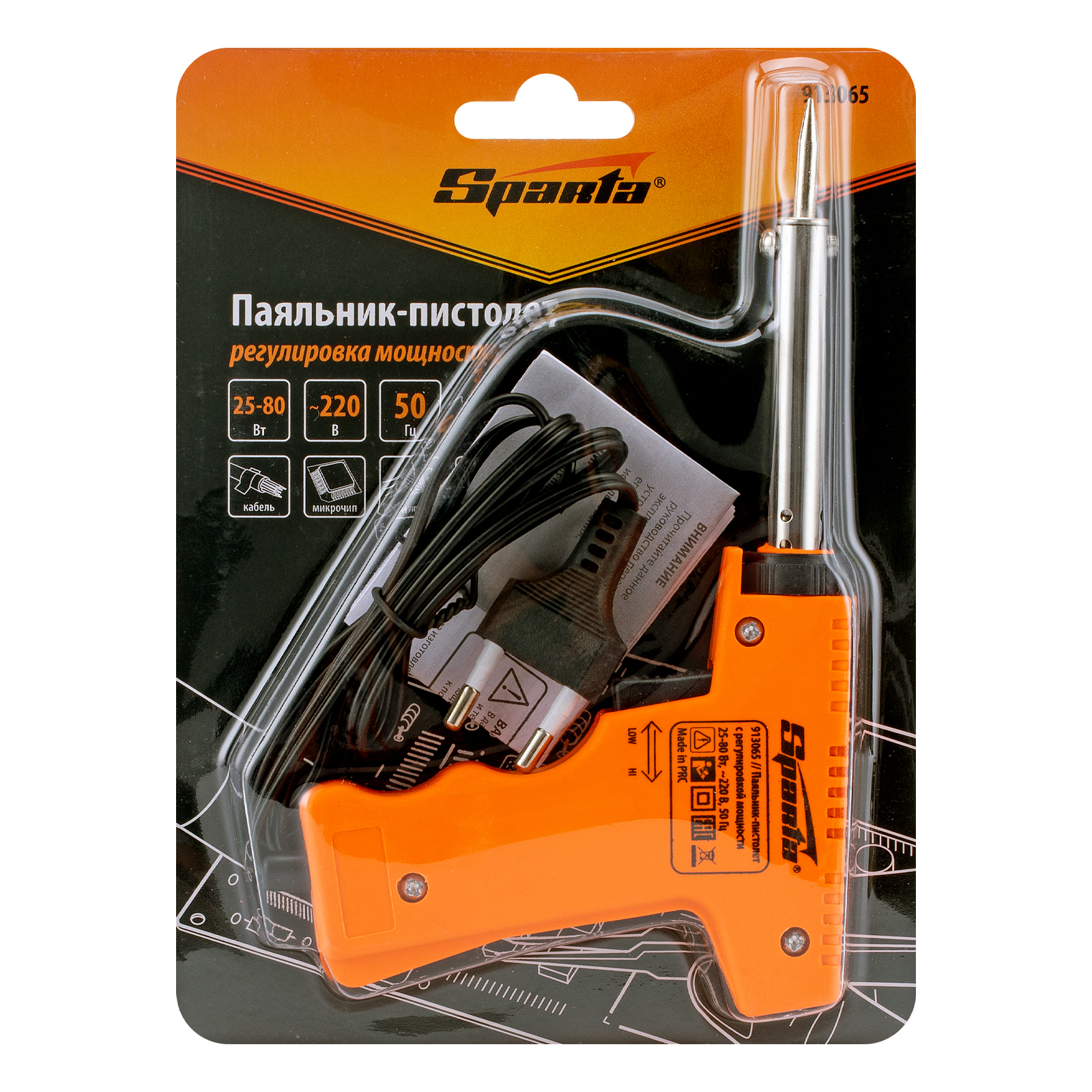 Паяльник-пистолет Sparta 913065 с регулировкой мощности в диапазоне 25-80 Вт питается от сети 220 В и предназначен для пайки микрочипов, транзисторов, электросхем, кабелей. Благодаря керамическому нагревательному элементу подходит для длительной непрерывной работы. Съемное жало может быть заменено в случае необходимости. Температура нагрева регулируется нажатием кнопки на рукоятке. Простой в применении прибор пригодится электромонтерам, радиолюбителям, автоэлектрикам, а также будет полезен в быту.ПреимуществаБыстрая подготовка к работе — паяльник полностью разогревается за 6 секунд.Эффективная работа с деталями разного размера — потребляемая мощность регулируется в диапазоне от 25 до 80 Вт.Стабилизация температуры нагрева — потребление электроэнергии сокращается на 50%.Конусовидное жало — паяльник оптимален для выполнения точных работ.Комфортная работа — удобная рукоятка пистолетного типа надежно ложится в руку.