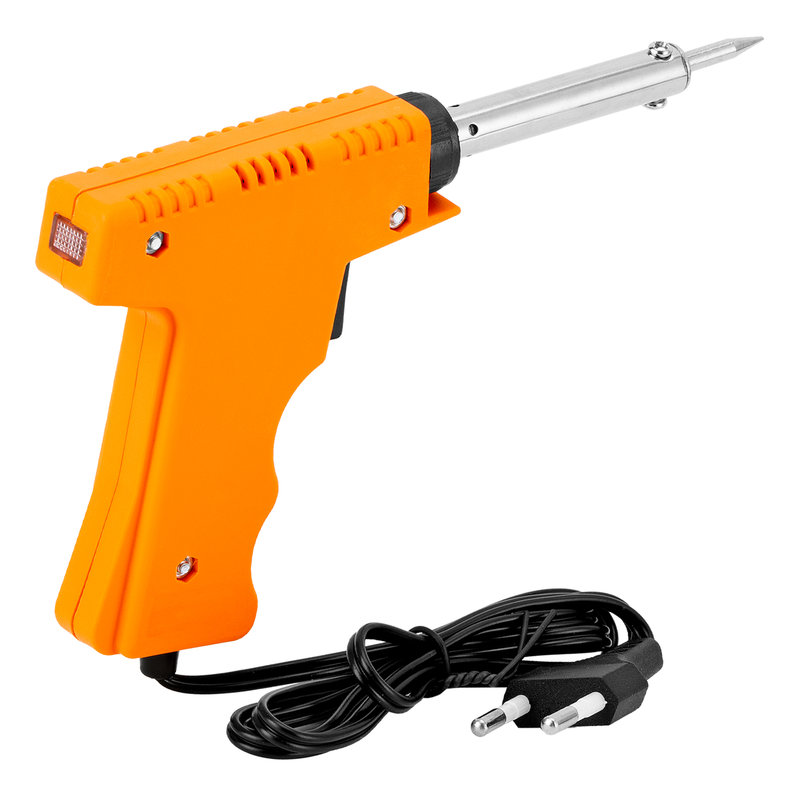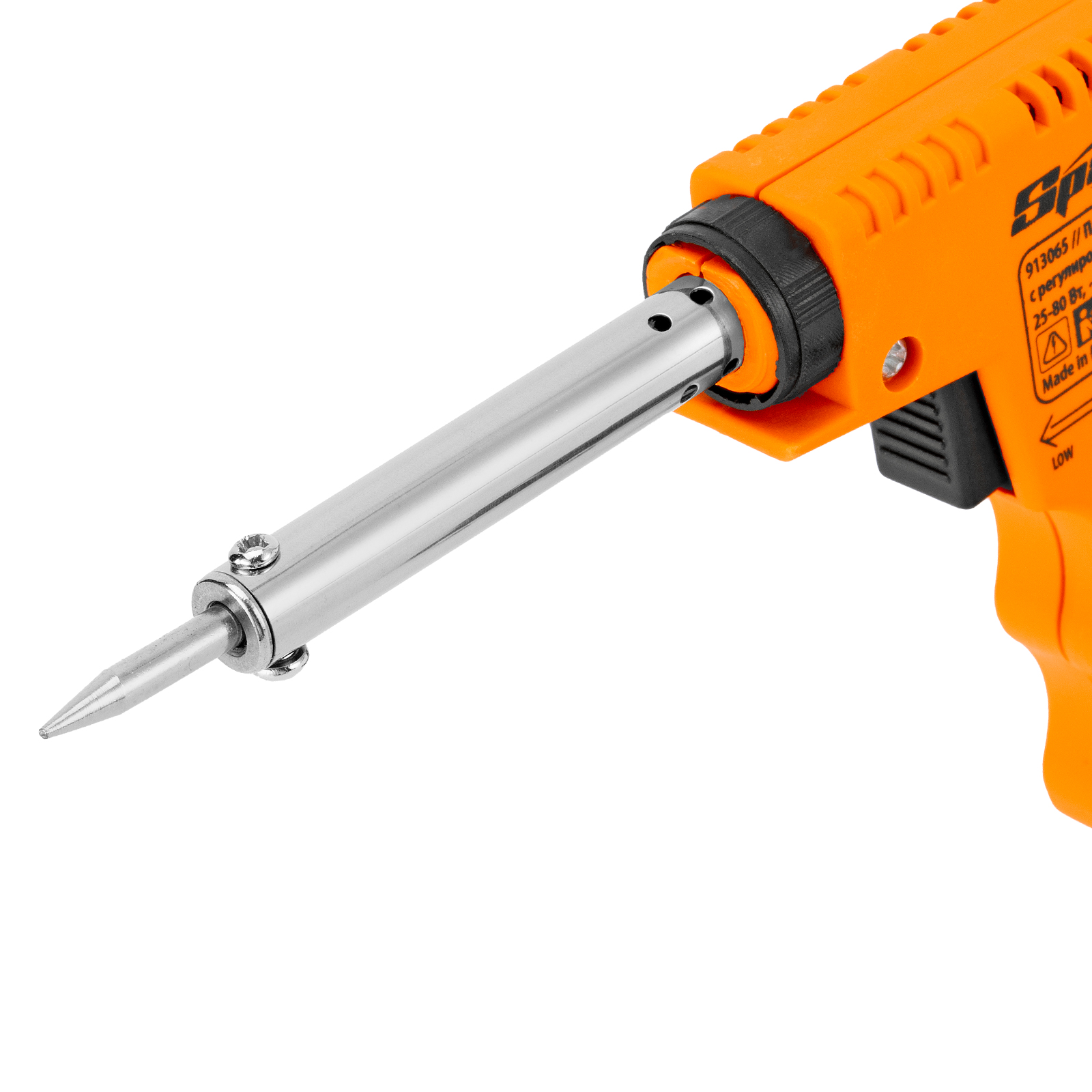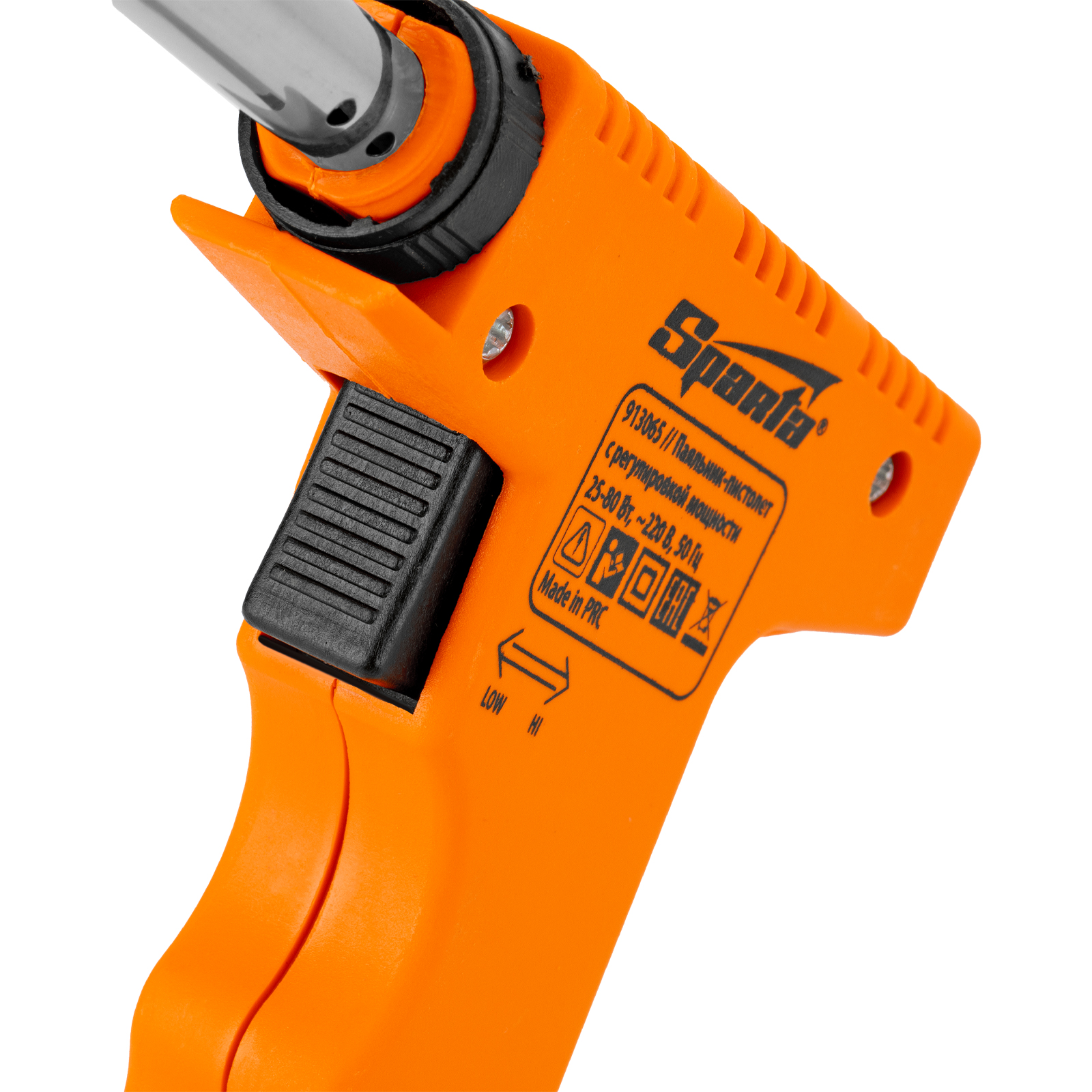 Паяльник-пистолет Sparta 913065 с регулировкой мощности в диапазоне 25-80 Вт питается от сети 220 В и предназначен для пайки микрочипов, транзисторов, электросхем, кабелей. Благодаря керамическому нагревательному элементу подходит для длительной непрерывной работы. Съемное жало может быть заменено в случае необходимости. Температура нагрева регулируется нажатием кнопки на рукоятке. Простой в применении прибор пригодится электромонтерам, радиолюбителям, автоэлектрикам, а также будет полезен в быту.ПреимуществаБыстрая подготовка к работе — паяльник полностью разогревается за 6 секунд.Эффективная работа с деталями разного размера — потребляемая мощность регулируется в диапазоне от 25 до 80 Вт.Стабилизация температуры нагрева — потребление электроэнергии сокращается на 50%.Конусовидное жало — паяльник оптимален для выполнения точных работ.Комфортная работа — удобная рукоятка пистолетного типа надежно ложится в руку.