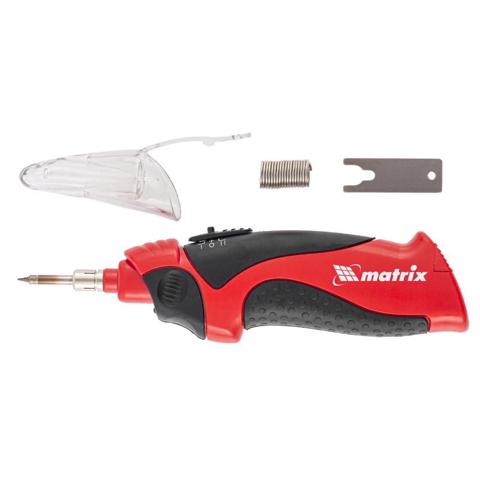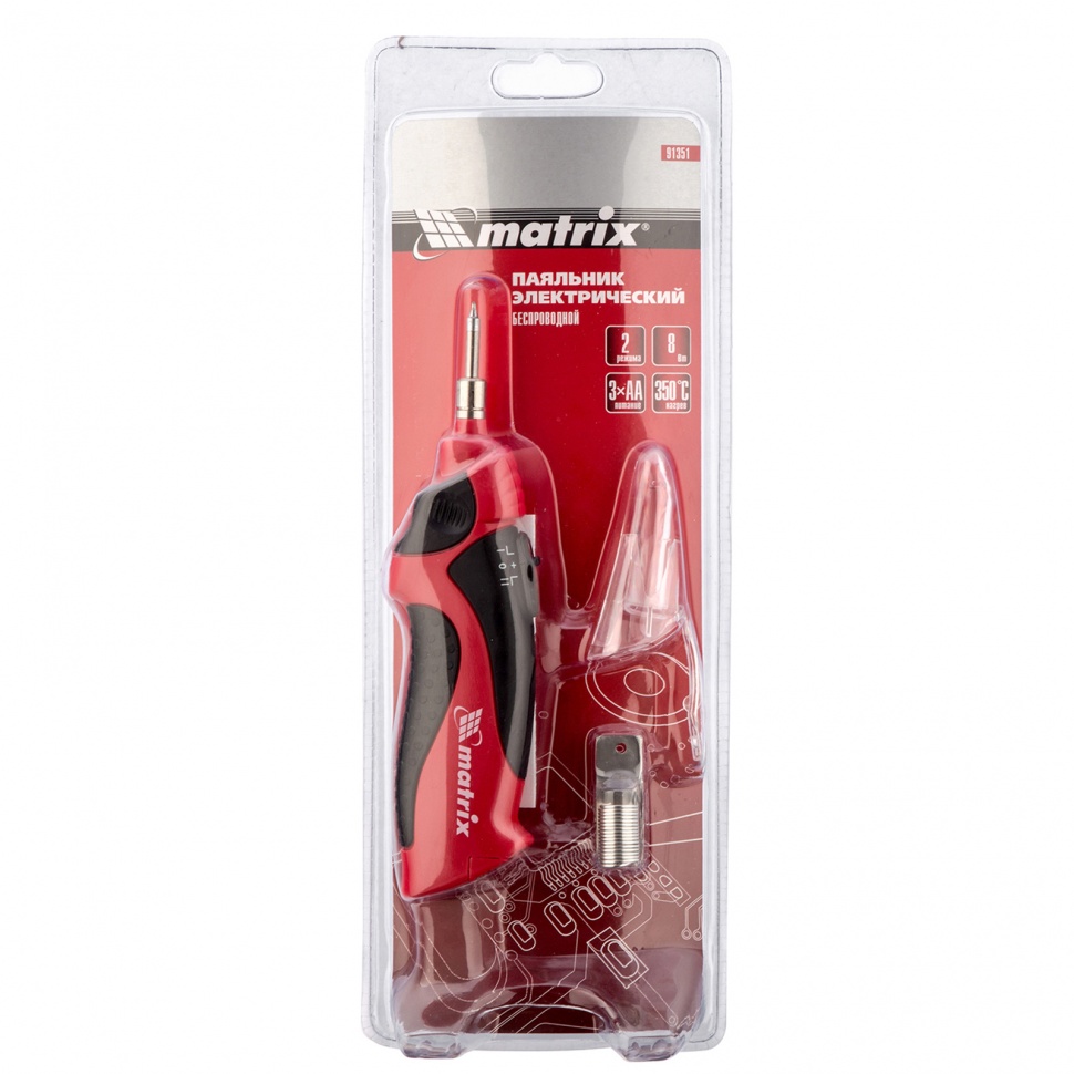 Беспроводной паяльник Matrix 91351 с рабочим напряжением 4,5 В и мощностью 8 Вт, с припоем 10 г и подставкой, работает от 3 элементов питания AA, жало разогревается до 350 °C. Прибор позволяет отремонтировать электротехнику в условиях отсутствия подключения к сети 220 В. Необходимый для этого припой входит в комплект поставки. Медное жало быстро нагревается, а защитное покрытие препятствует его обгоранию. Нихромовая спираль устойчива к повреждениям, что обеспечивает надежность прибора.ПреимуществаВысокая точность пайки — паяльник имеет компактные размеры и конусовидное жало, вмонтированный в корпус светодиод обеспечивает хорошую видимость рабочей зоны.Комфортная работа — обрезиненная рукоятка с рельефной поверхностью надежно ложится в руку.Безопасное хранение и транспортировка — пластиковый колпачок защищает жало от повреждений.