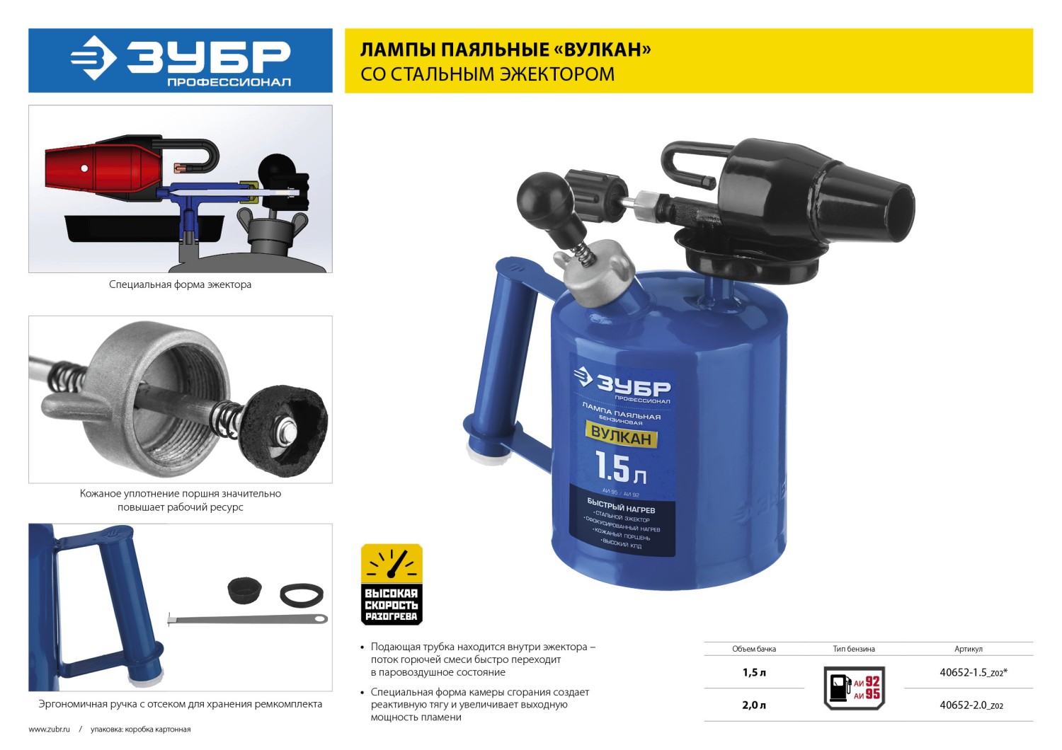 Лампа проста по конструкции, удобна и надежна в эксплуатации. Отличается высокой скоростью разогрева, длительным временем работы на одной заправке. Применяется для нагрева до высокой температуры различных деталей