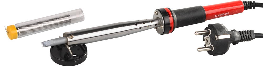 <p>Электропаяльник СВЕТОЗАР SV-55300-100 предназначен для пайки проводов, работы с печатными платами и других видов работ с электронными деталями. Рукоятка паяльника выполнена двухкомпонентной и отлично лежит в руке, что делает работу более комфортной. Инструмент оснащен высококачественным нагревательным элементом, способным нагревать жало до температуры 400 градусов.</p><h4>Преимущества</h4><ul><li>Качественный нагревательный элемент нагревает жало до необходимой температуры за считанные минуты</li><li>Долговечное медное жало со специальным покрытием</li><li>Удобная двухкомпонентная рукоятка</li><li>В комплект также входят подставка под паяльник и припой</li><li>Высококачественное жало</li></ul><h4>Использование</h4><p>Предназначен для проведения паяльных работ.</p>