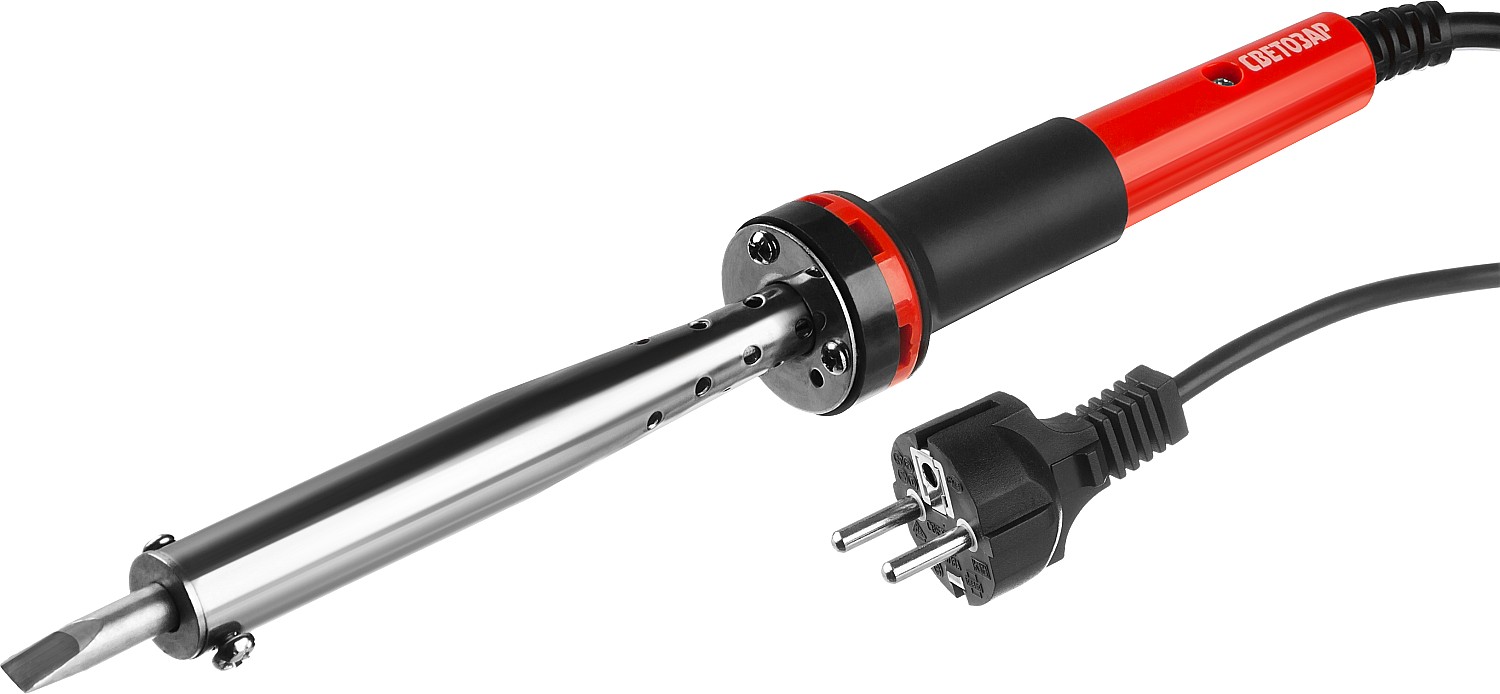<p>Электропаяльник СВЕТОЗАР SV-55300-80 предназначен для пайки проводов, работы с печатными платами и других видов работ с электронными деталями. Надежность и длительный срок службы клиновидного жала инструмента достигается за счет специального покрытия. Инструмент оснащен высококачественным нагревательным элементом, способным нагревать жало до температуры 400 градусов.</p><h4>Преимущества</h4><ul></ul><h4>Использование</h4><p>Предназначен для проведения паяльных работ.</p>