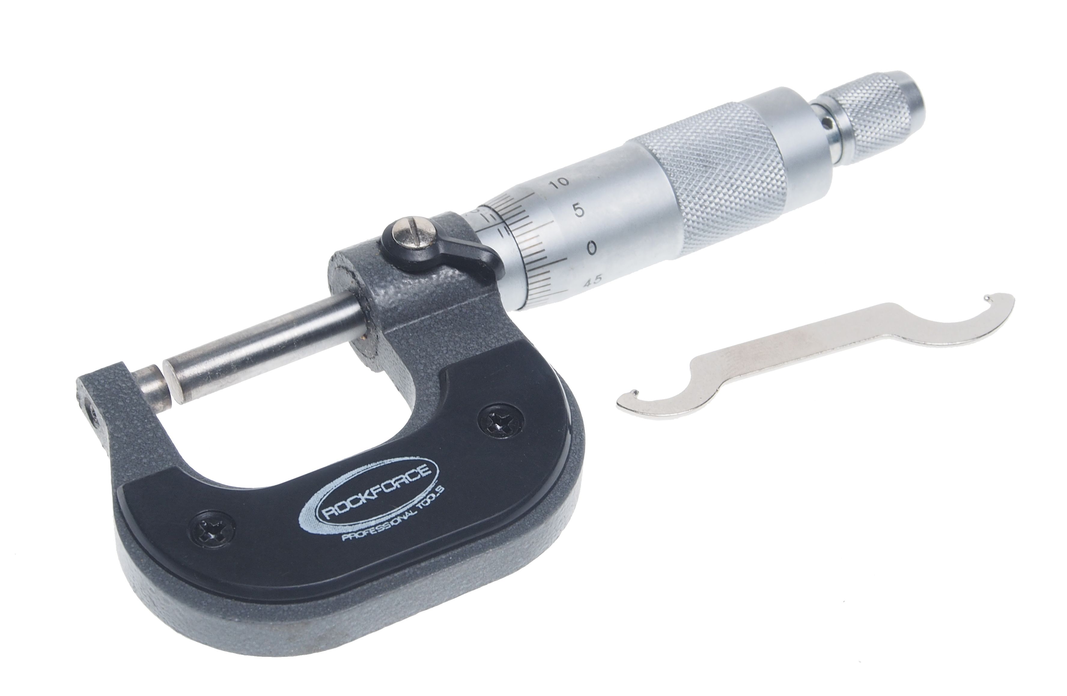 Микрометр RockForce (0-25мм, 0.01мм), в футляре измерительный инструмент, предназначенный для определения линейных размеров деталей. Модель применяют при обработке различных деталей, при сборке механизмов или же при регулировке различного промышленного оборудования.
