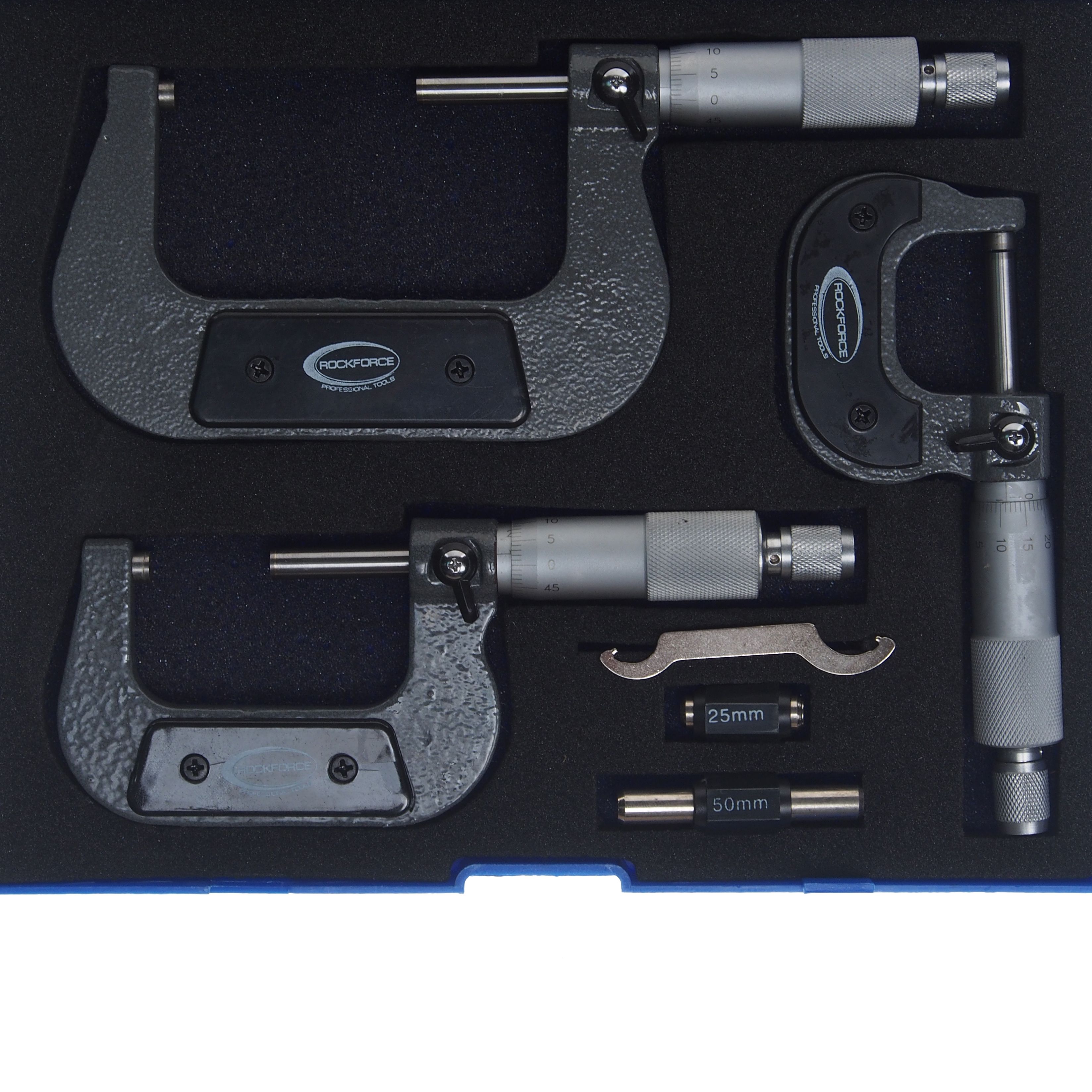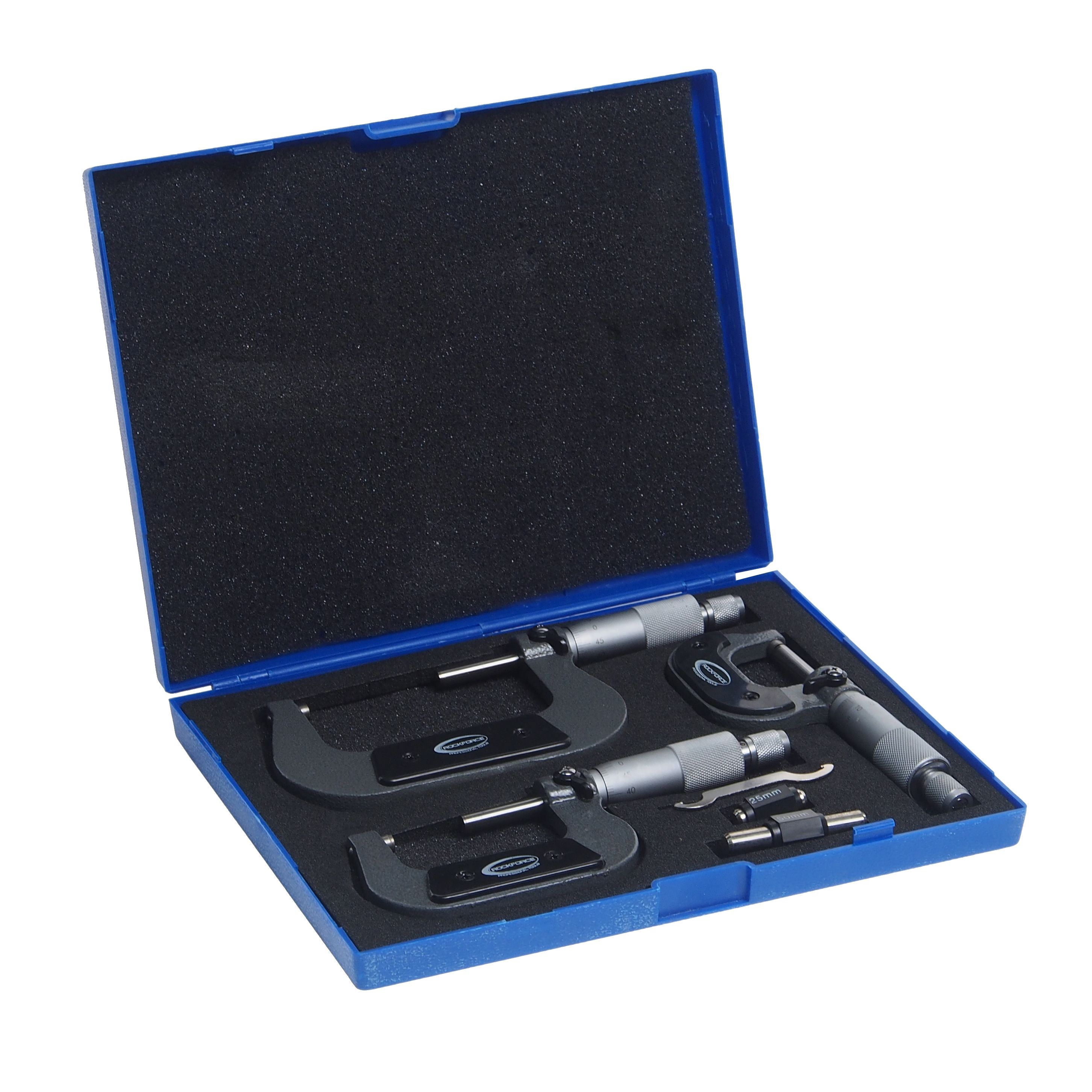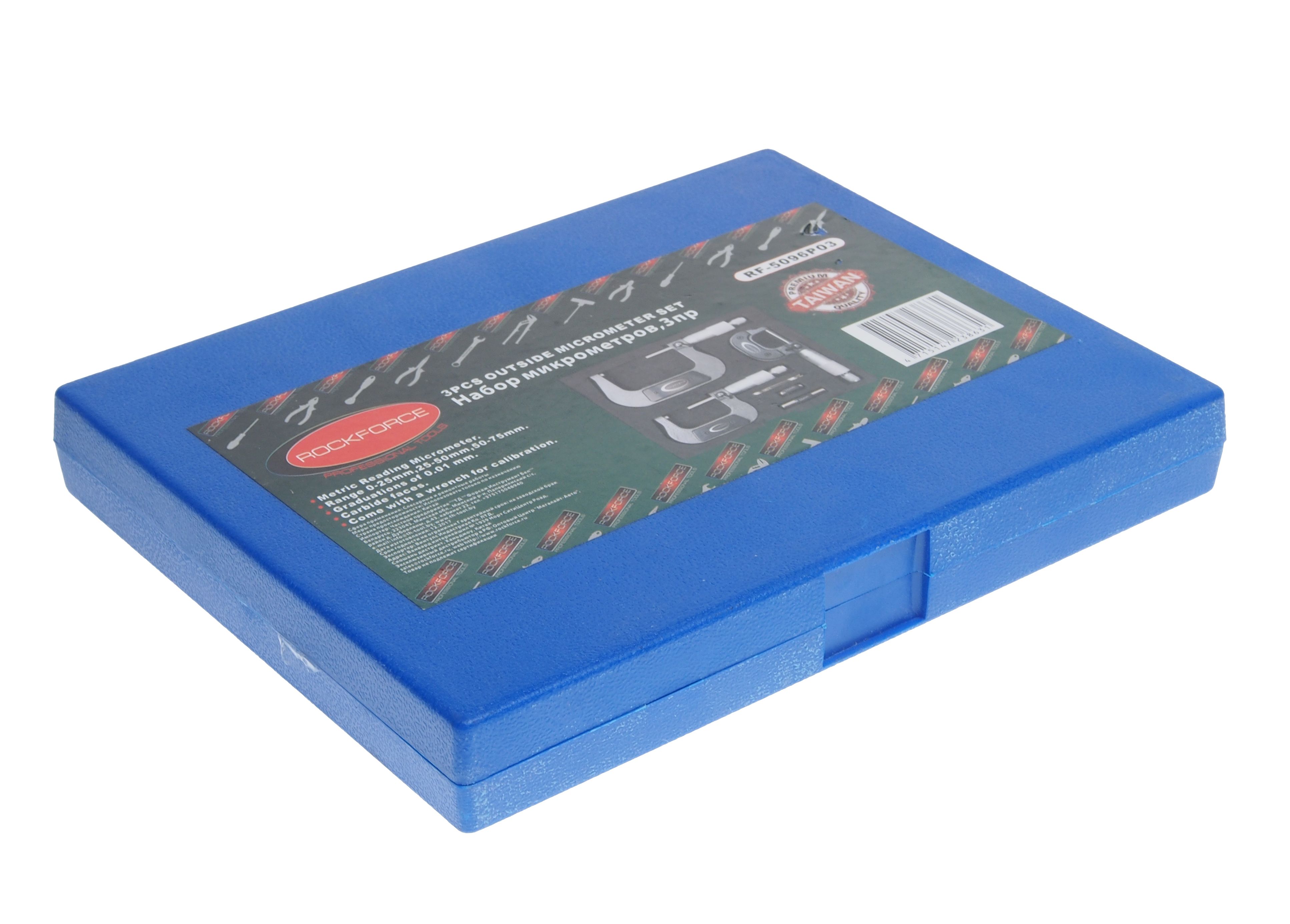 Набор микрометров RockForce, 3 предметов в наборе (0-25, 25-50, 50-75мм, 0.01мм), в футляре измерительный инструмент, предназначенный для определения линейных размеров деталей. Модель применяют при обработке различных деталей, при сборке механизмов или же при регулировке различного промышленного оборудования.