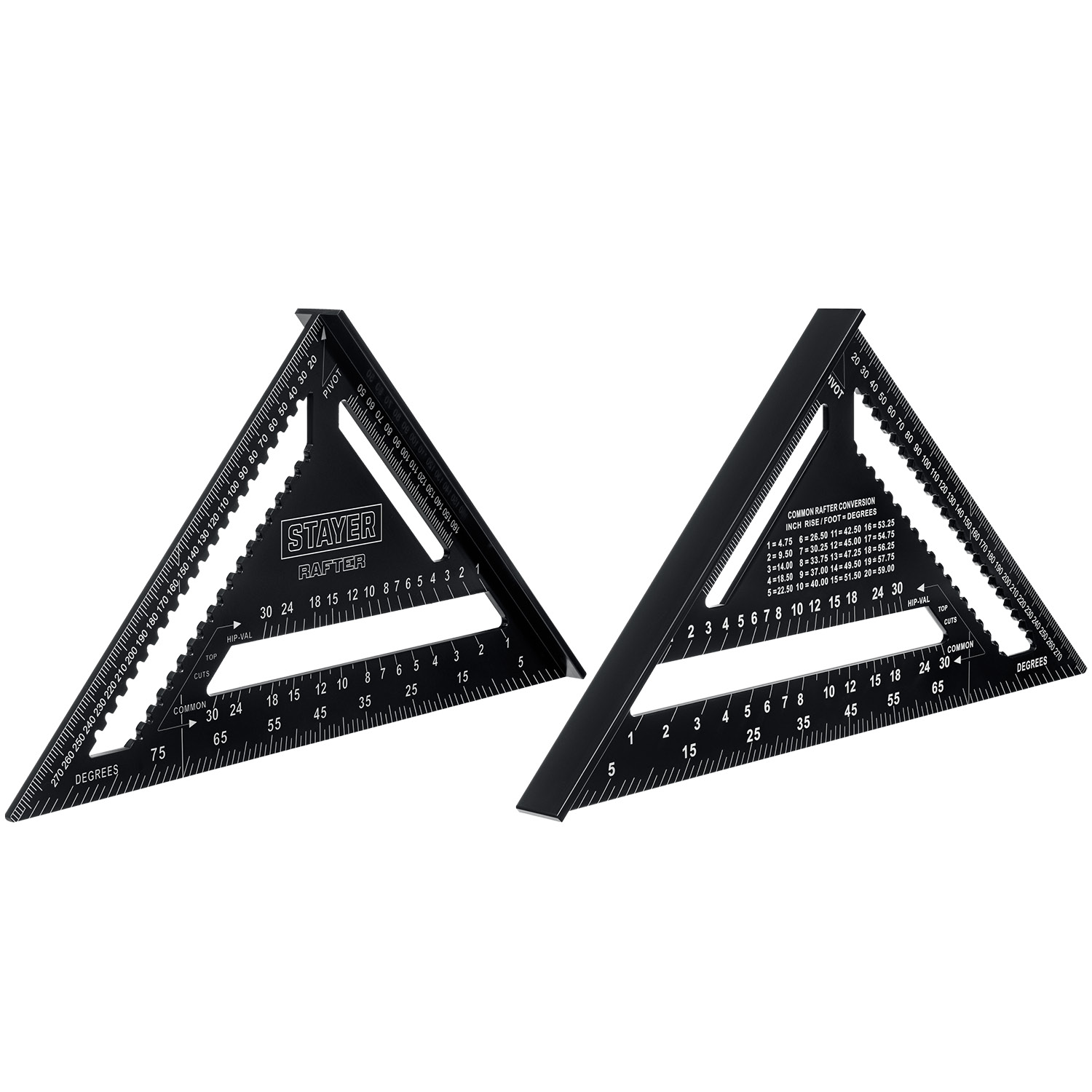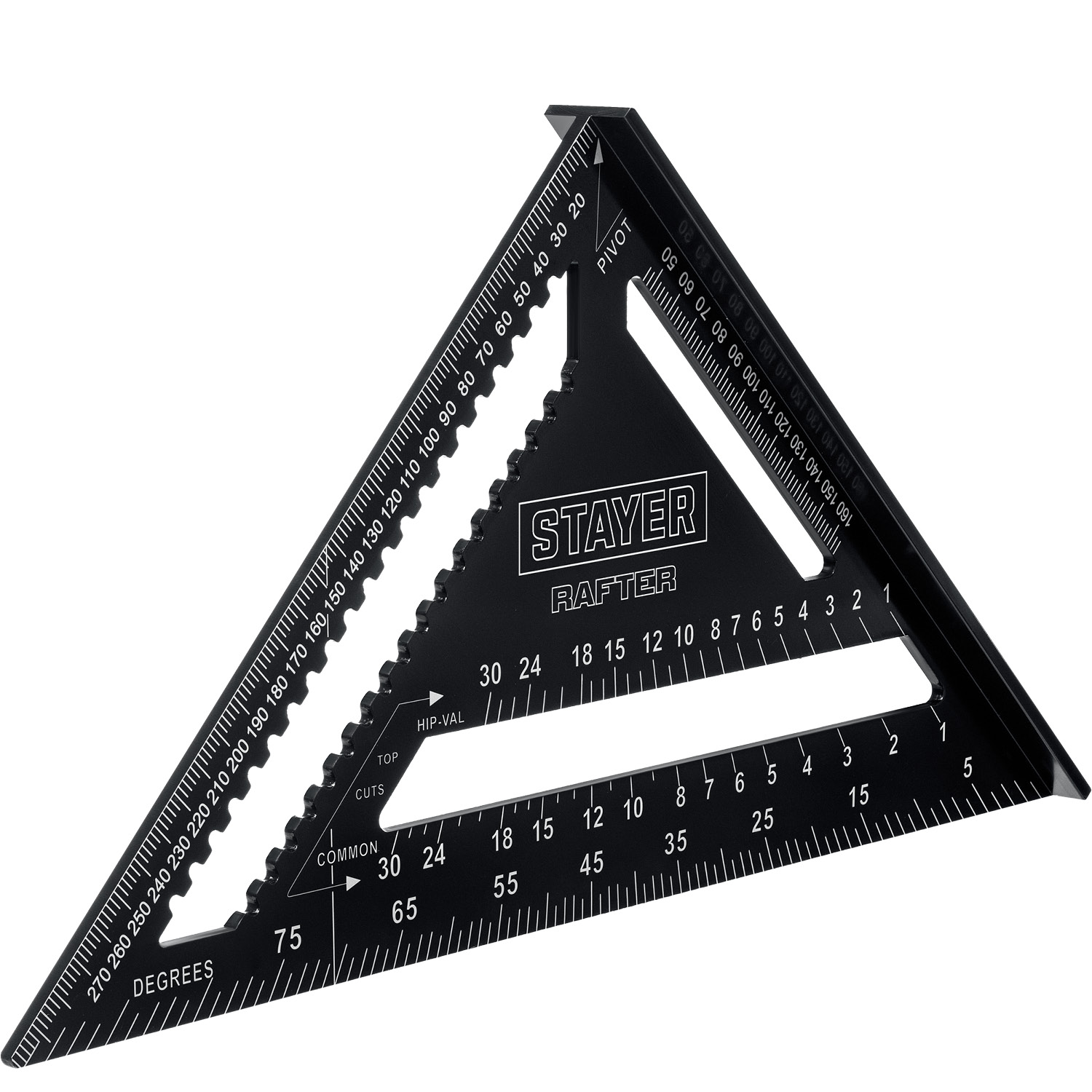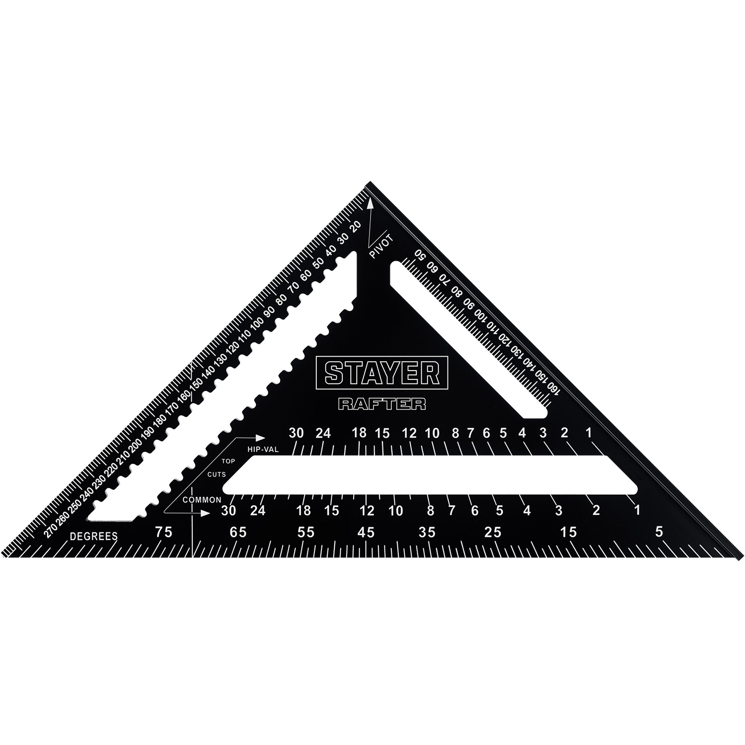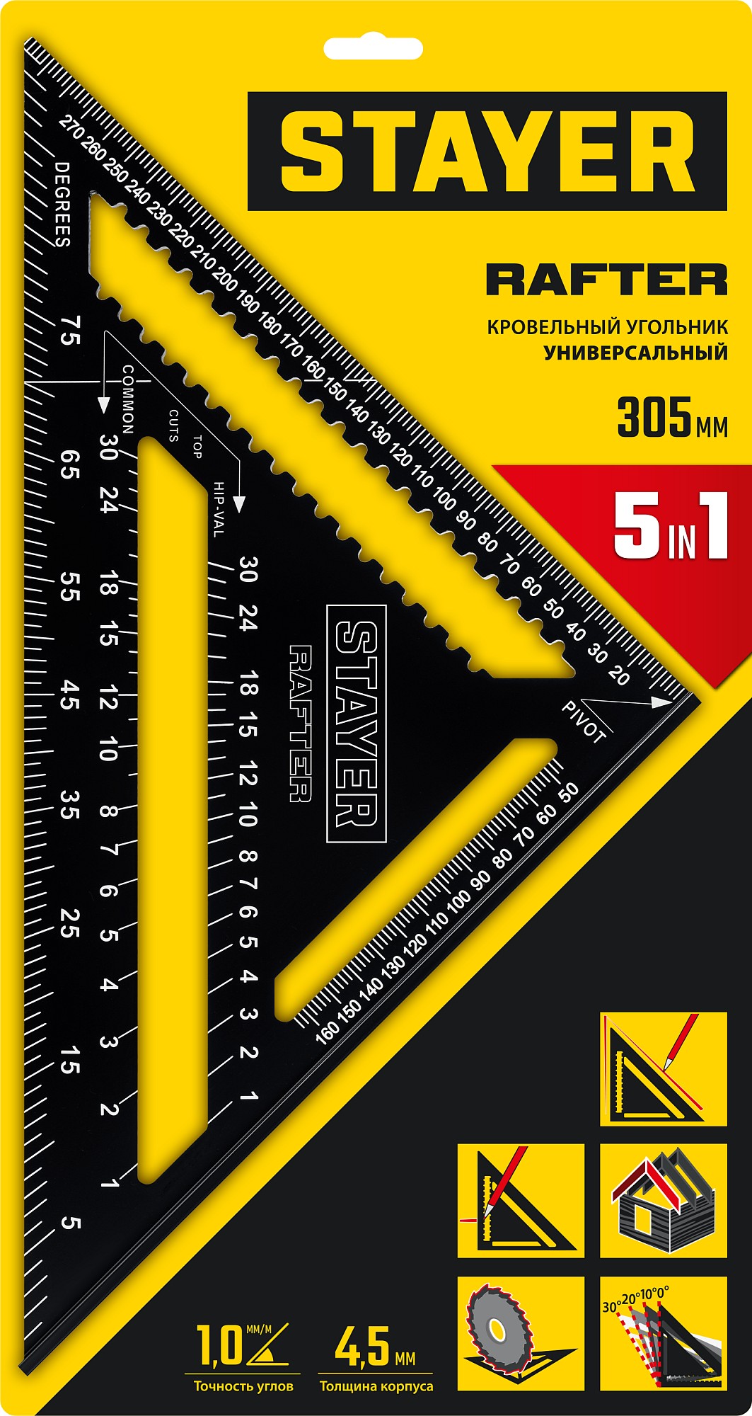 Универсальный кровельный угольник инструмент для точного определения расстояния в диапазоне от 0 до 300 мм. Может применяться в качестве торцовочного угольника, транспортира, рейсмуса и направляющей для пилы.