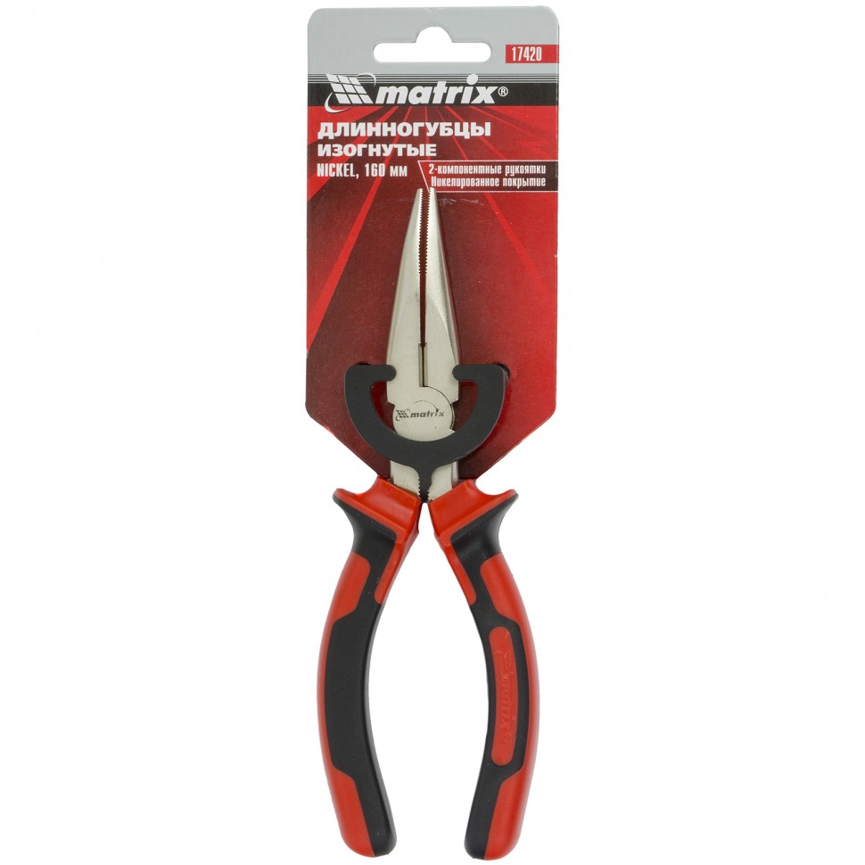 Изогнутые никелированные длинногубцы Matrix NICKEL 17420 длиной 160 мм, с двухкомпонентными рукоятками, помогают удерживать небольшие детали и перекусывать проволоку. Изогнутая форма губок позволяет дотягиваться до деталей в труднодоступных местах. Длинногубцы используются для проведения ремонтных и монтажных работ.ПреимуществаПовышенная прочность — инструмент изготовлен из высококачественной стали, рабочие кромки закалены до твердости 53 HRC.Износостойкость и защита от коррозии — на рабочие части нанесено никелевое покрытие.Комфортная работа — двухкомпонентные рукоятки удобно лежат в руке и не выскальзывают из ладони.
