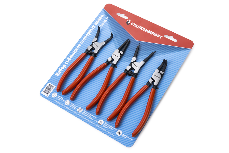 В наборе присутствуют как прямые съемники так и изогнутые под углом 90 градусов. Диаметр рабочей части съемника составляет 1,7 мм, что в свою очередь позволяет работать со стопорными кольцами от 18 до 60 мм.