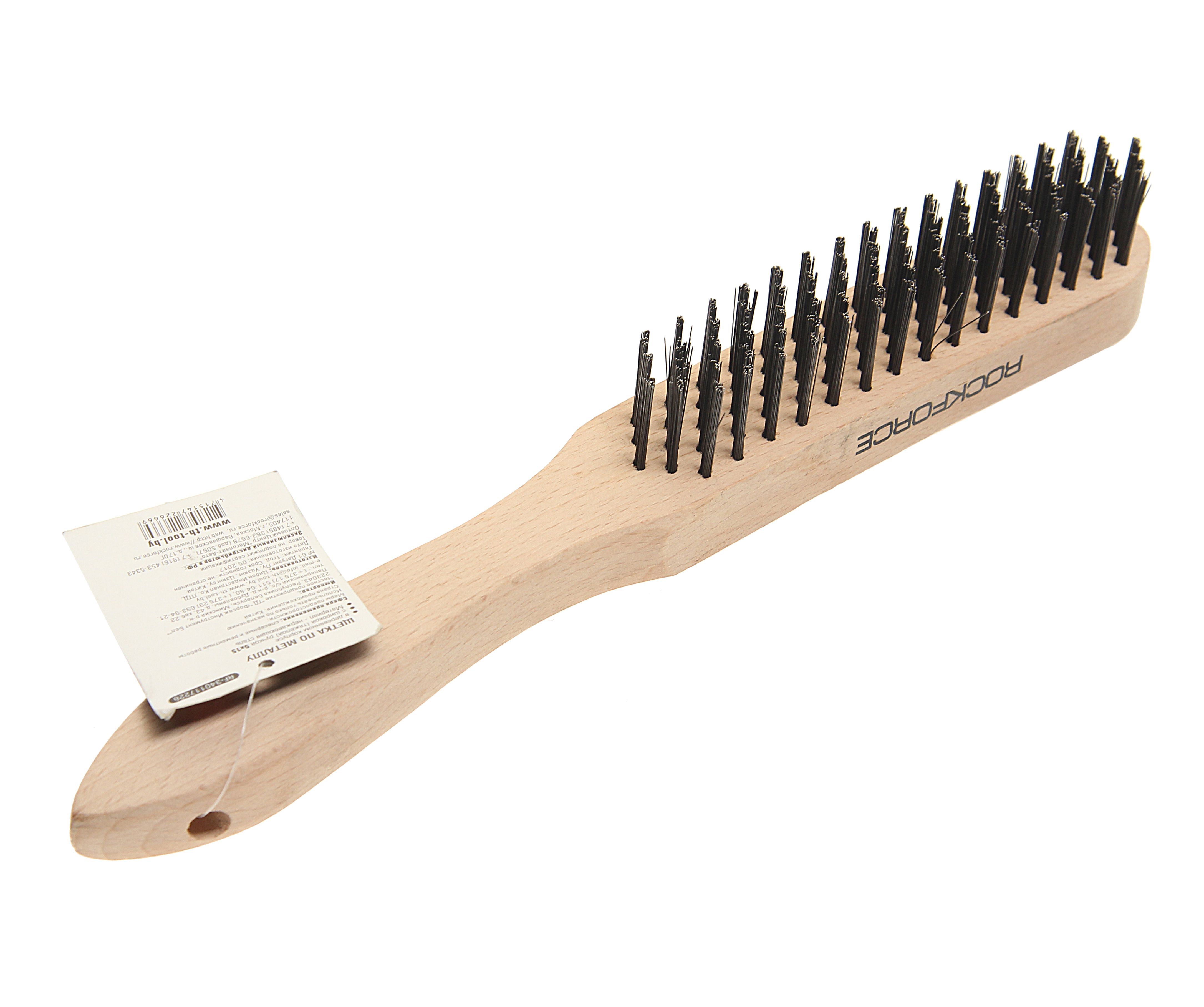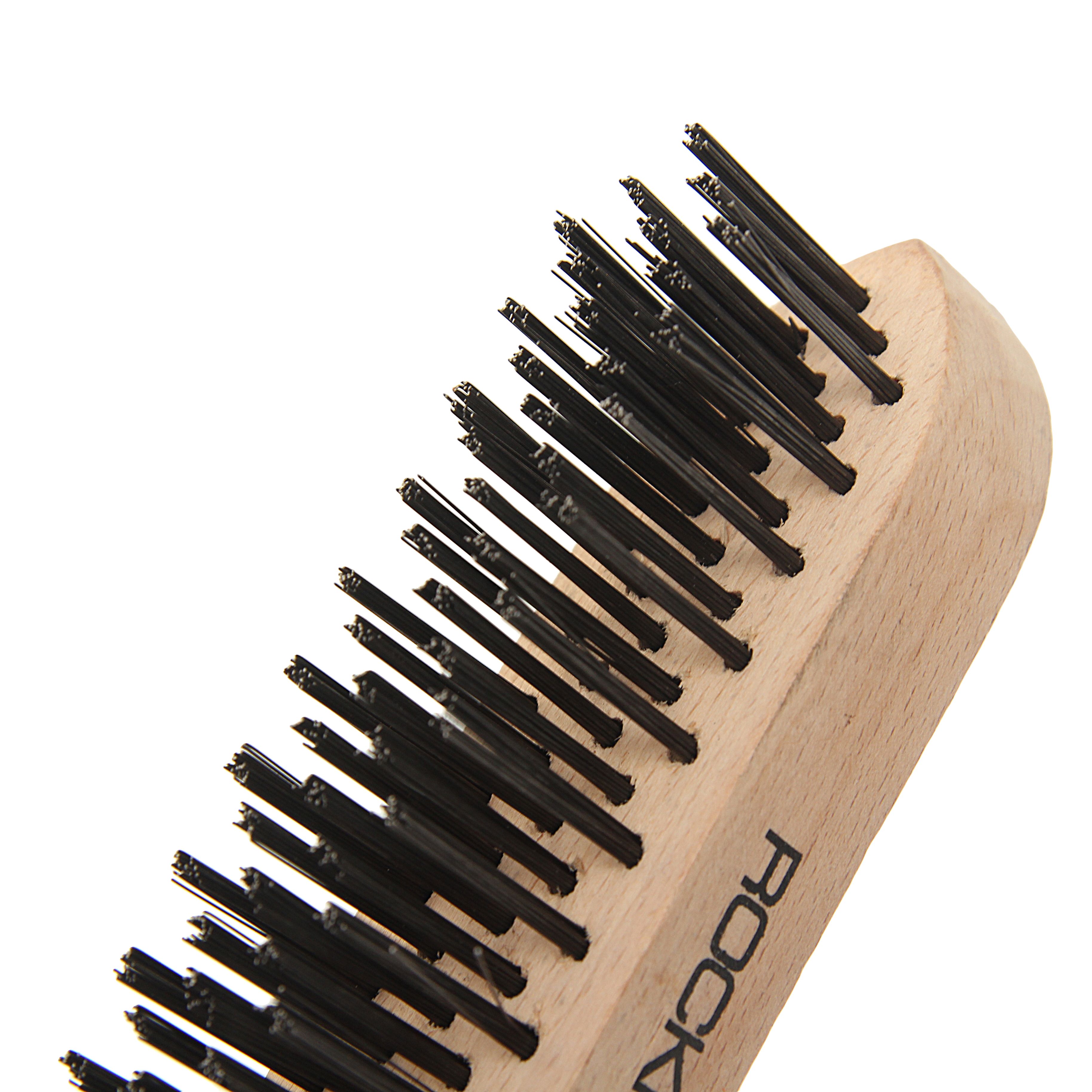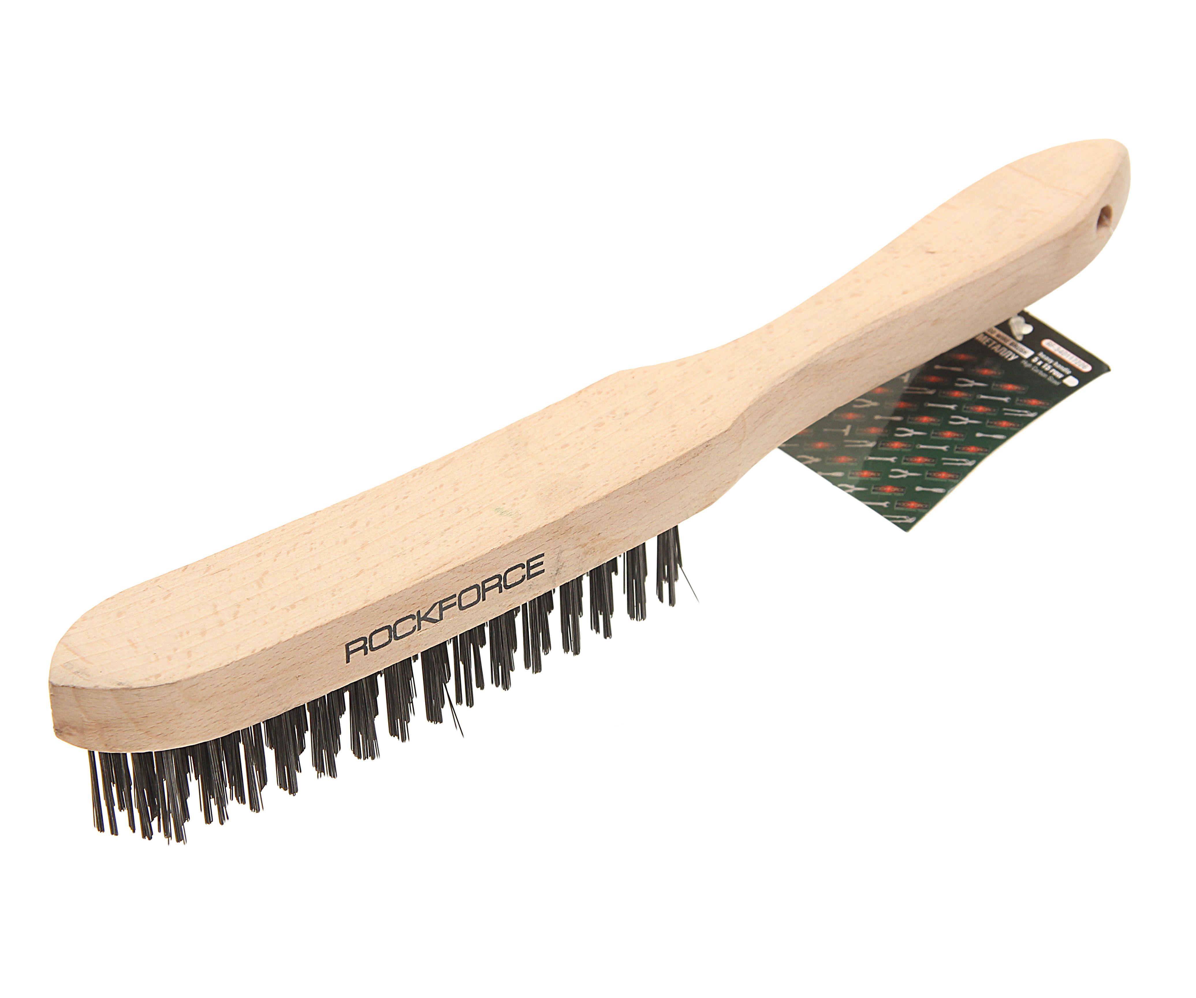 Щетка по металлу RockForce ручная в усиленном деревянном корпусе (проволока из нержавеющей стали, 5×15рядов) изделие сочетающие в себе стальные щетины, с дополнительным покрытием. Применяются при очистке металлических поверхностей от старой краски, грязи и ржавчины.