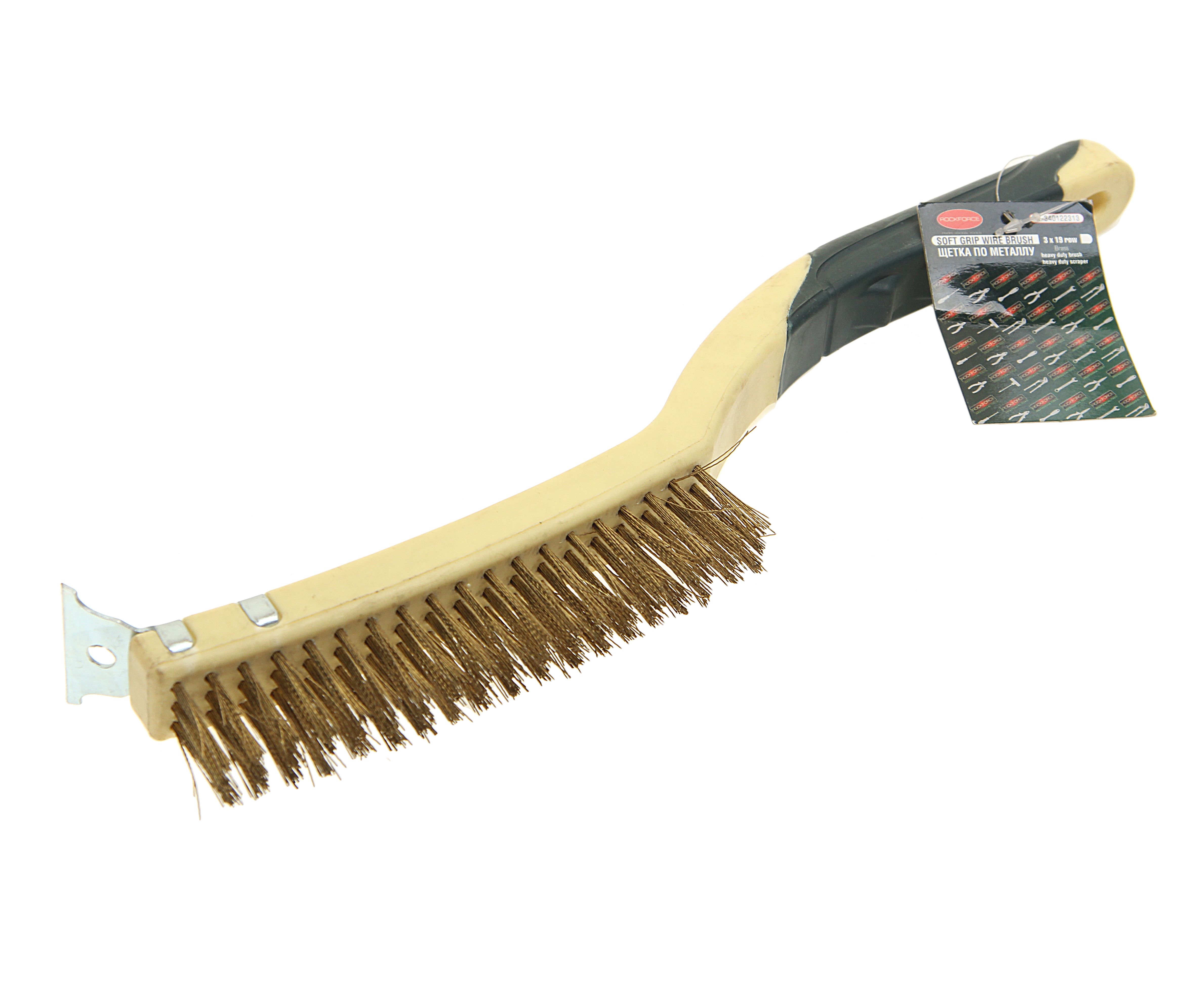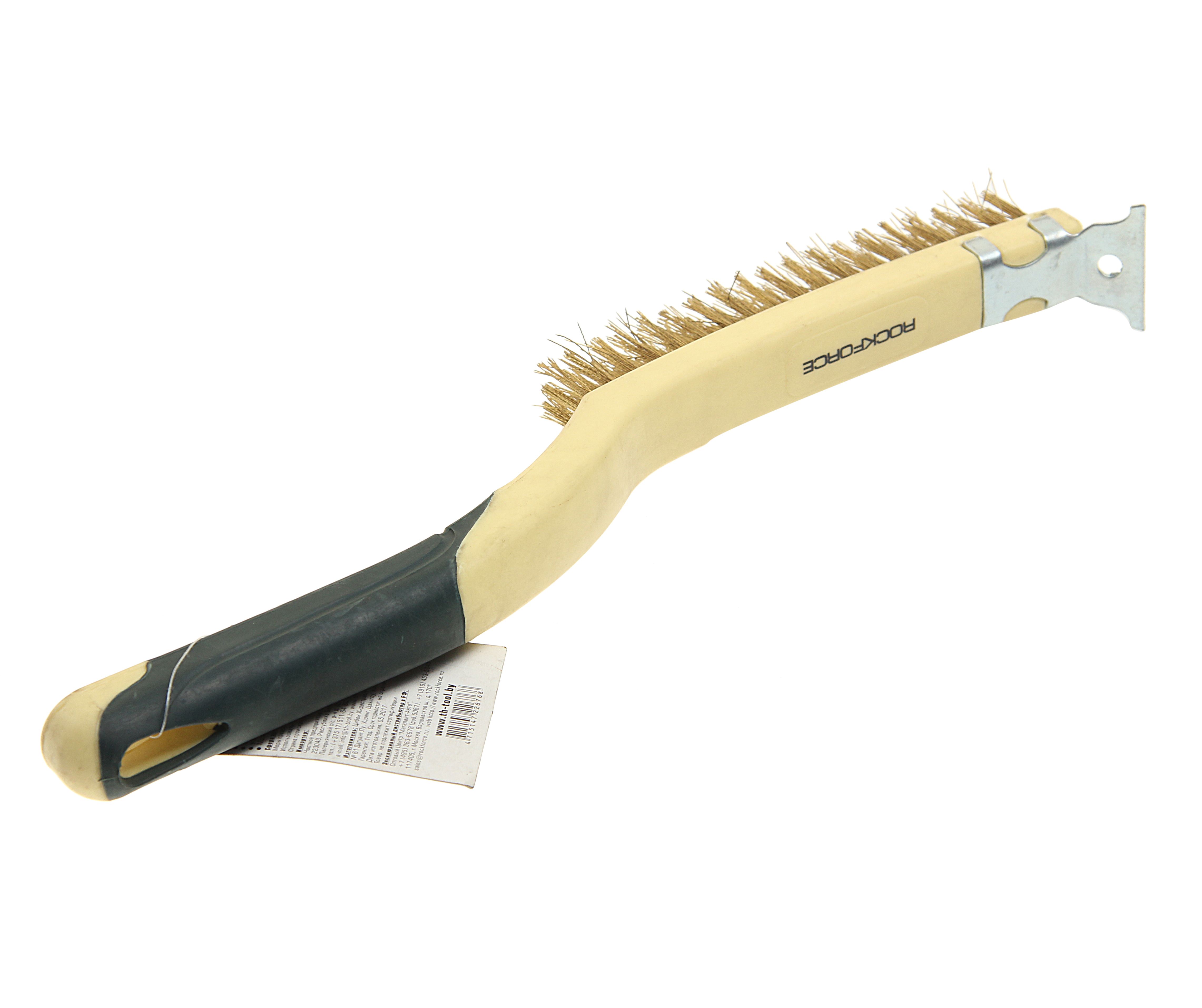 Щетка по металлу RockForce ручная в пластиковом корпусе с прорезиненной рукояткой (металлический скребок-40мм, латунь, 3×19рядов) изделие сочетающие в себе стальные щетины, с дополнительным покрытием. Применяются при очистке металлических поверхностей от старой краски, грязи и ржавчины.