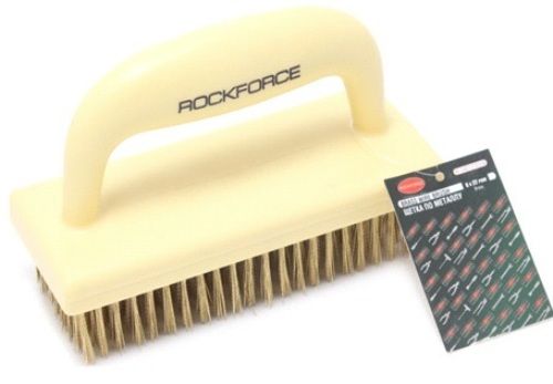 Щетка по металлу RockForce ручная в пластиковом корпусе с П-образной рукояткой (латунная проволока, 8×22ряда) изделие сочетающие в себе стальные щетины, с дополнительным покрытием. Применяются при очистке металлических поверхностей от старой краски, грязи и ржавчины.