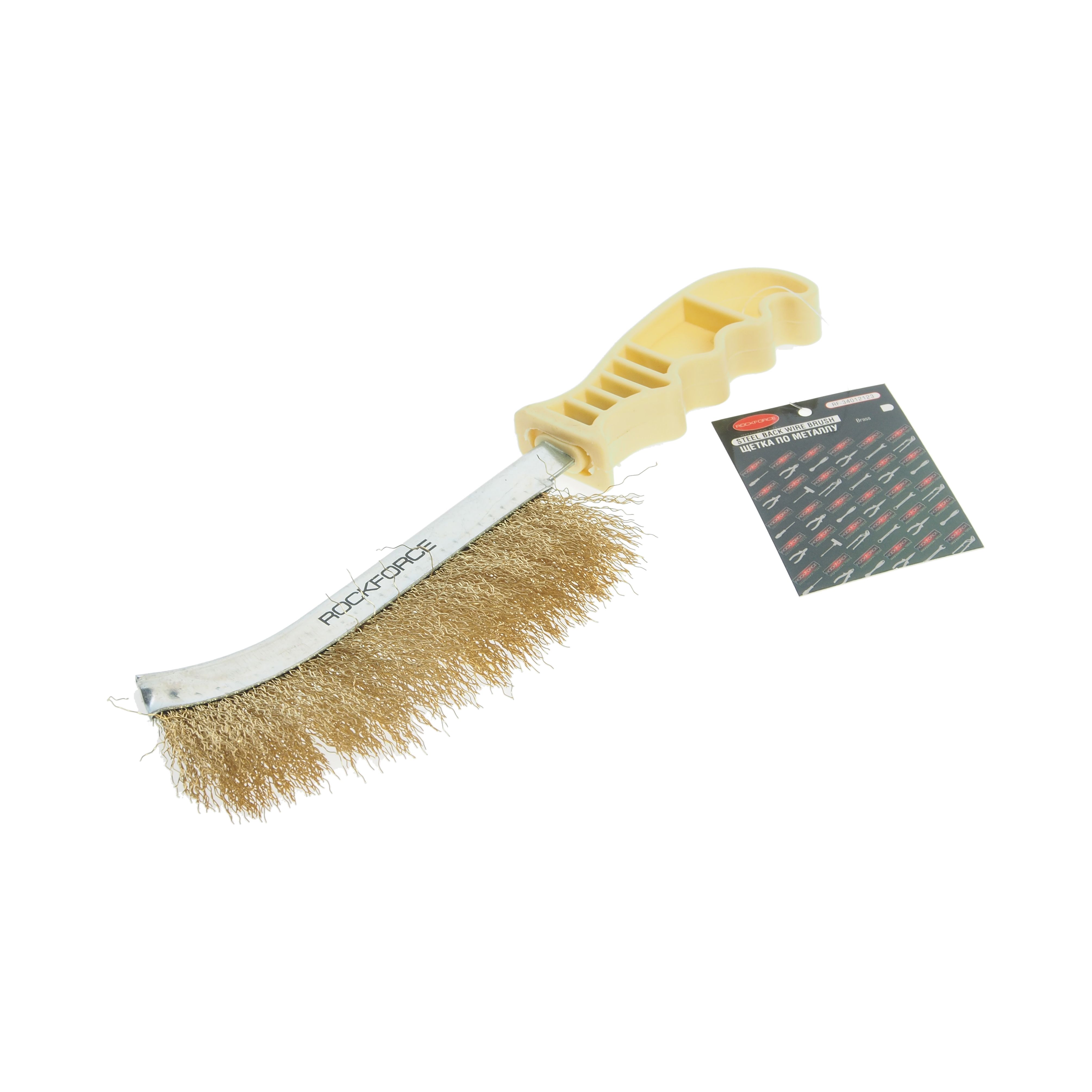 Щетка по металлу RockForce ручная в железном корпусе с пластиковой рукояткой (латунь) изделие сочетающие в себе стальные щетины, с дополнительным покрытием. Применяются при очистке металлических поверхностей от старой краски, грязи и ржавчины.