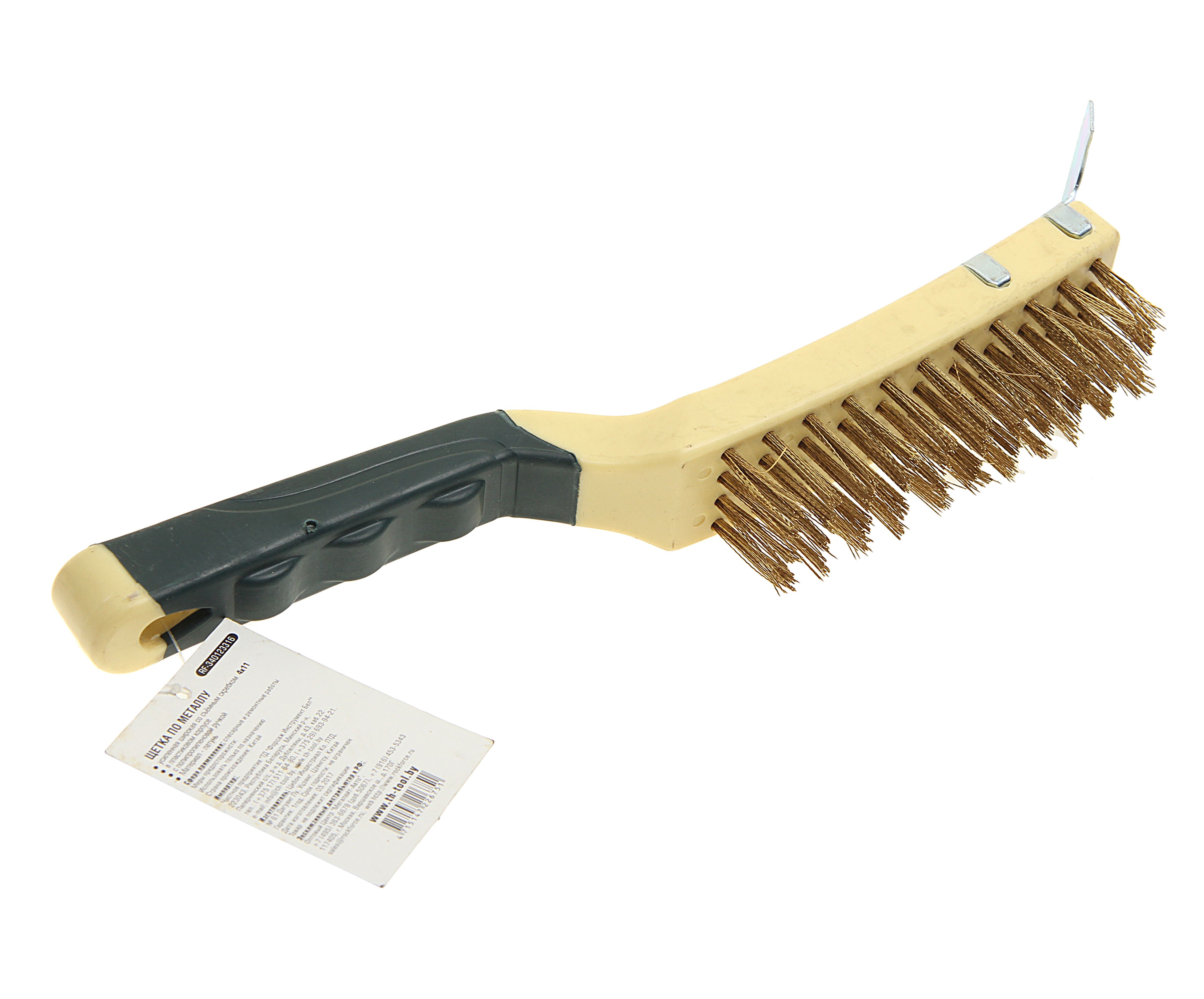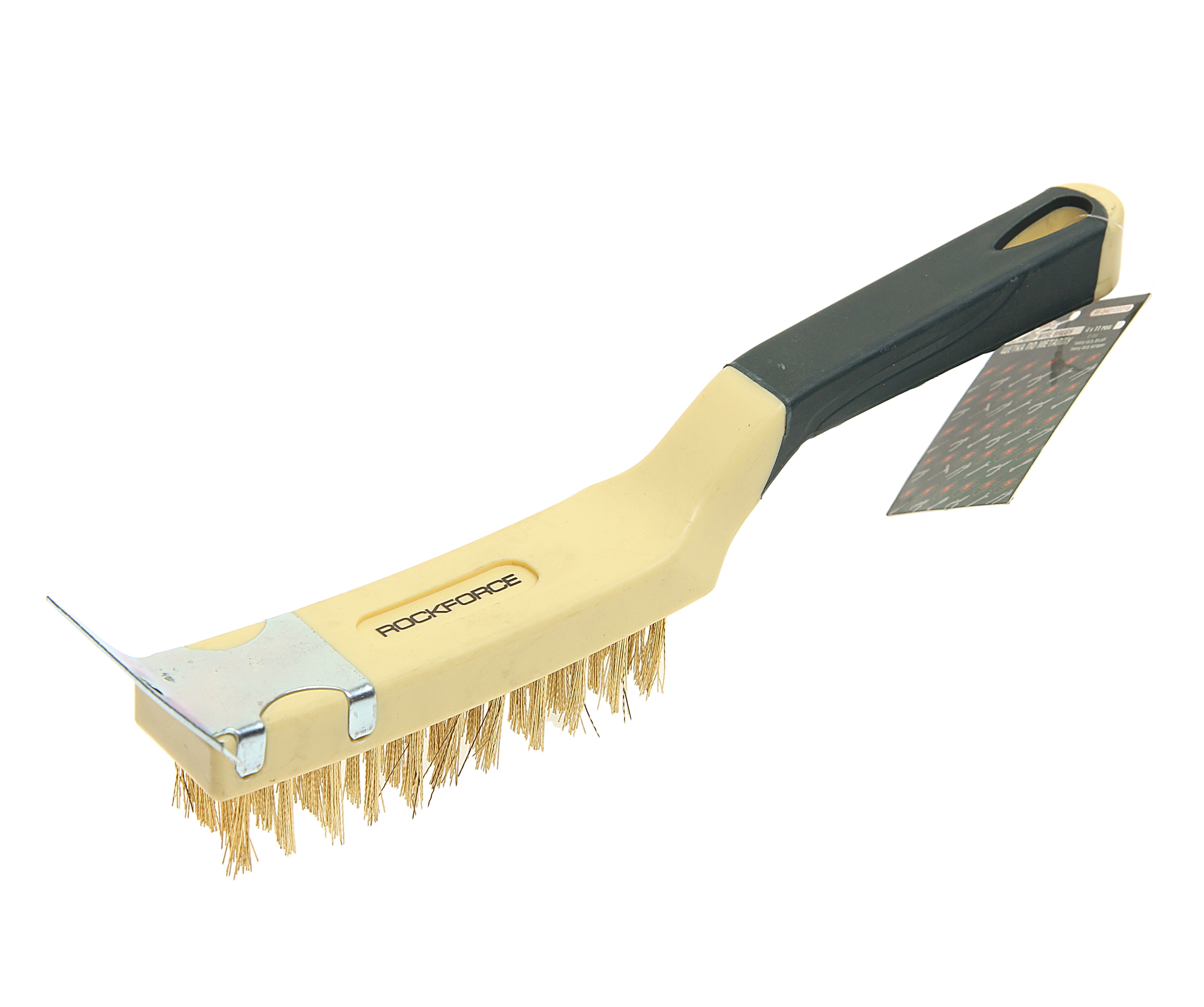 Щетка по металлу RockForce ручная в пластиковом корпусе с прорезиненной рукояткой (металлический скребок-70мм, латунь, 4×11рядов) изделие сочетающие в себе стальные щетины, с дополнительным покрытием. Применяются при очистке металлических поверхностей от старой краски, грязи и ржавчины.