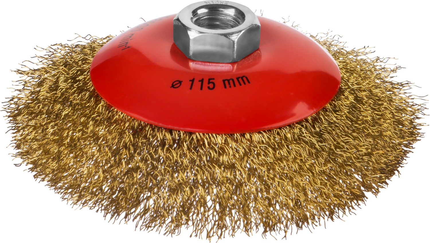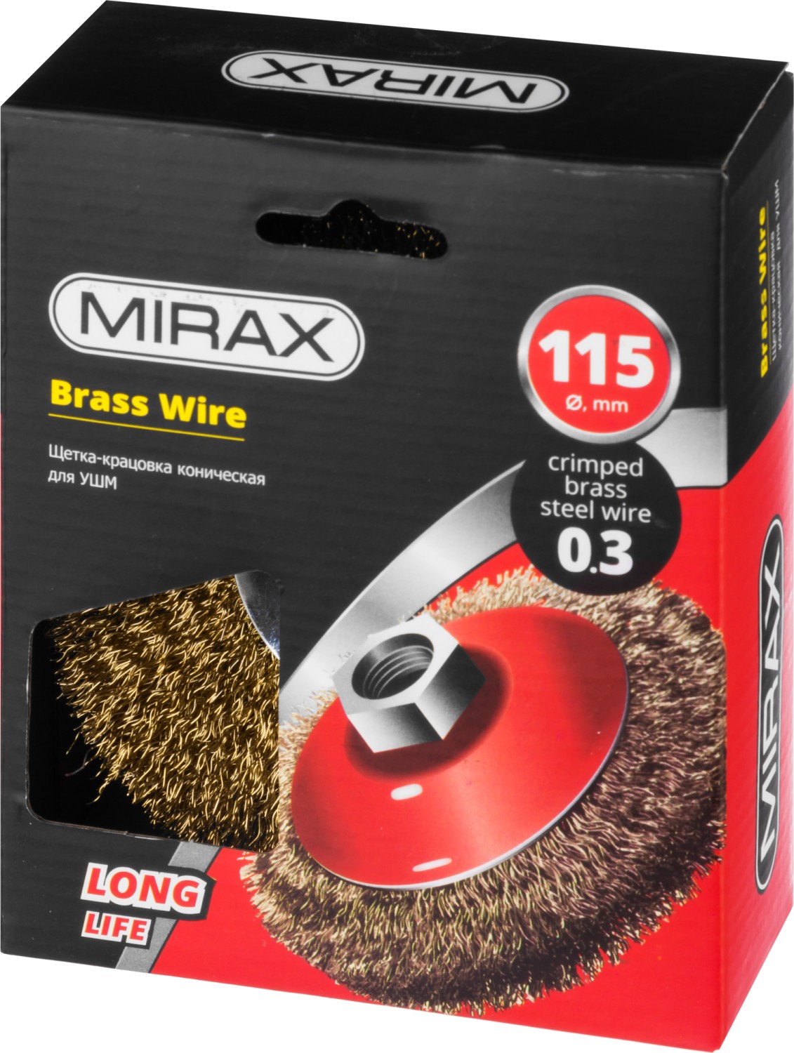 —MIRAX 115 мм, витая стальная латунированная проволока 0.3 мм, коническая щетка-крацовка для УШМ (35143-115)