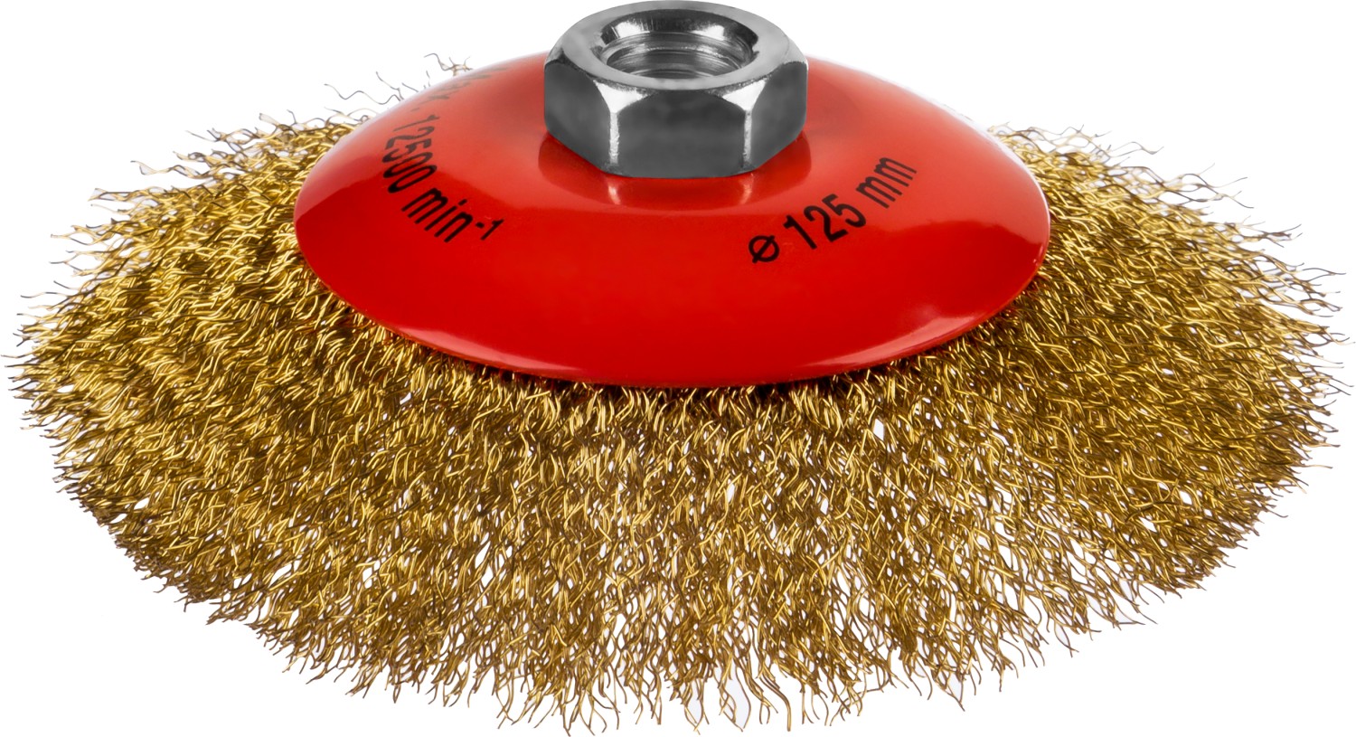 —MIRAX 125 мм, витая стальная латунированная проволока 0.3 мм, коническая щетка-крацовка для УШМ (35143-125)
