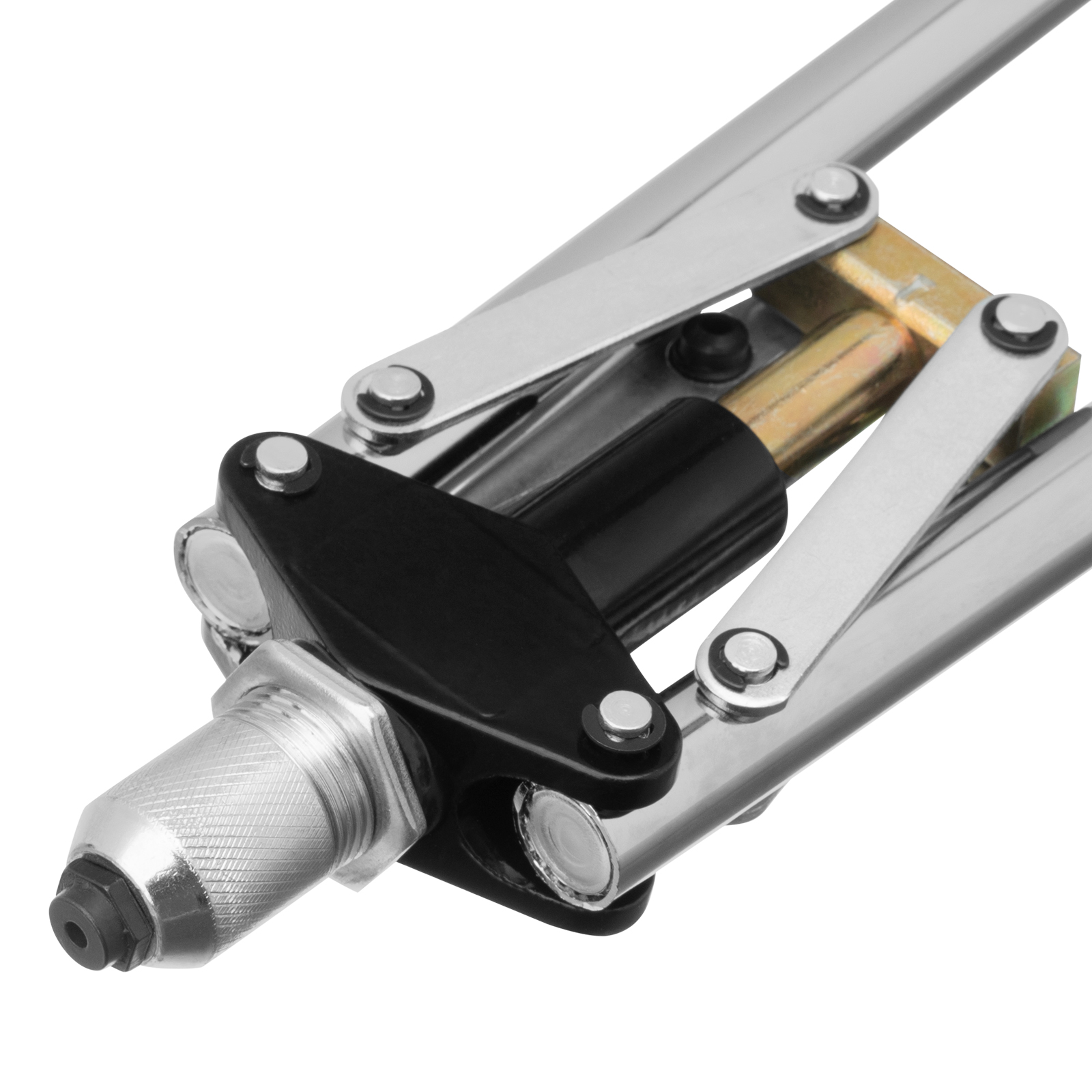 Двуручный усиленный заклепочник Sparta 405385 длиной 450 мм используется для скрепления металлических листов с помощью заклепок 3,2-4,0-4,8 мм. Он обеспечивает высокую производительность работы, т.к. требует меньше усилий от мастера в сравнении с одноручным инструментом. Благодаря усиленной конструкции инструмент рассчитан на высокие нагрузки.ПреимуществаЦельнометаллический корпус гарантирует долгий срок службы заклепочника.Удлиненные рукоятки с ПВХ покрытием обеспечивают надежный хват и удобство работы.Инструмент комплектуется сменными насадками, это позволяет использовать его с заклепками различного диаметра.Небольшой вес заклепочника 930 г позволяет снизить усталость в руках при длительной работе.