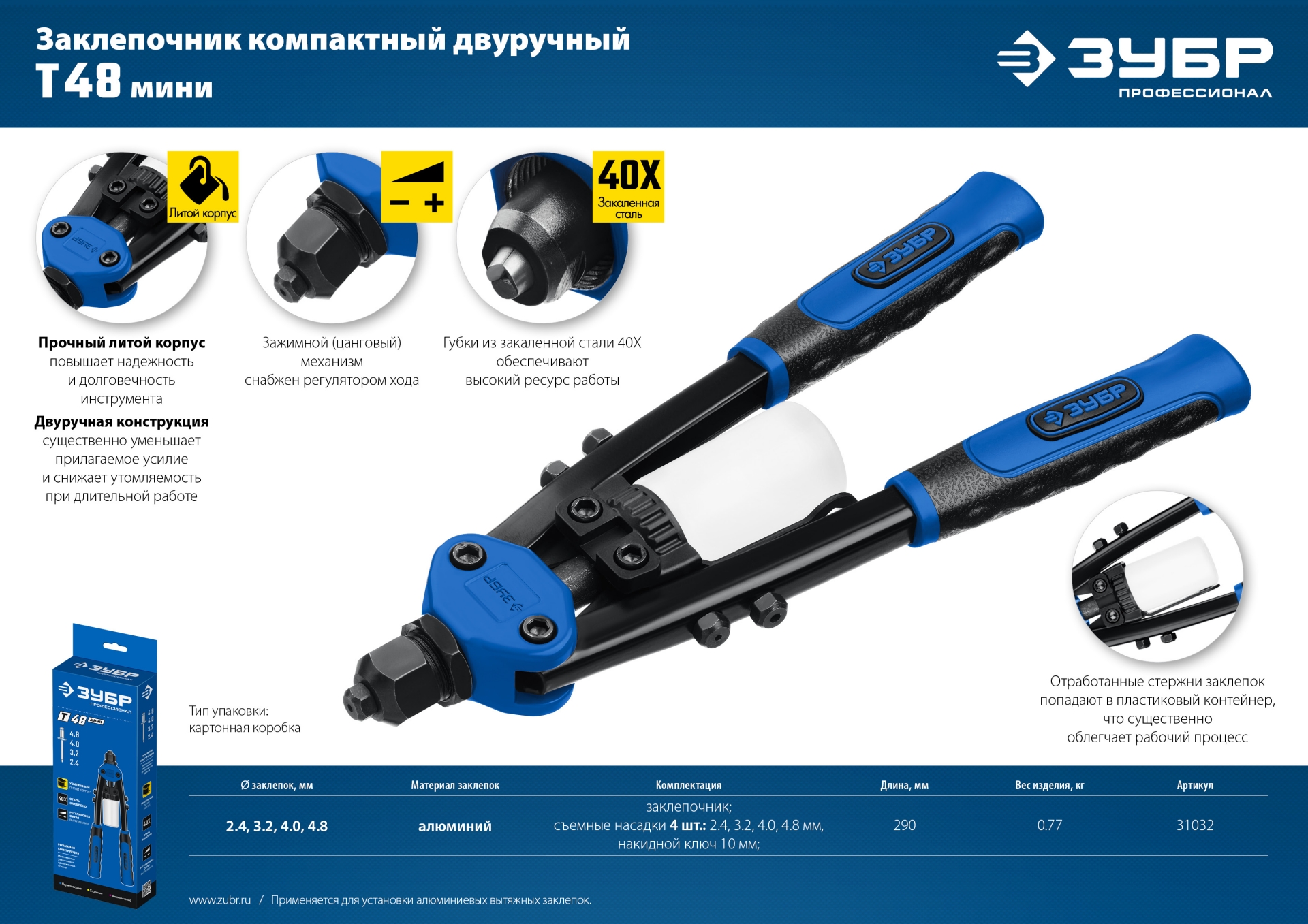Профессиональный инструмент для установки вытяжных заклепок. Двуручная конструкциия существенно экономит время и силы.