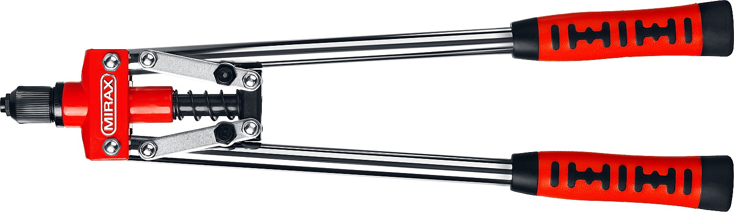 Заклепочник MIRAX благодаря двухрычажной конструкции механизма многократно увеличивает прилагаемое усилие, что позволяет снизить утомляемость при длительной работе.