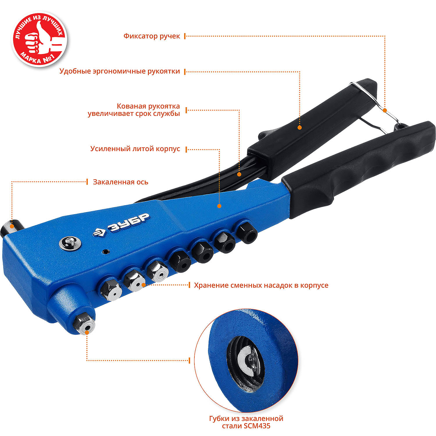 - Возможность работы как с вытяжными, так и с резьбовыми заклепками