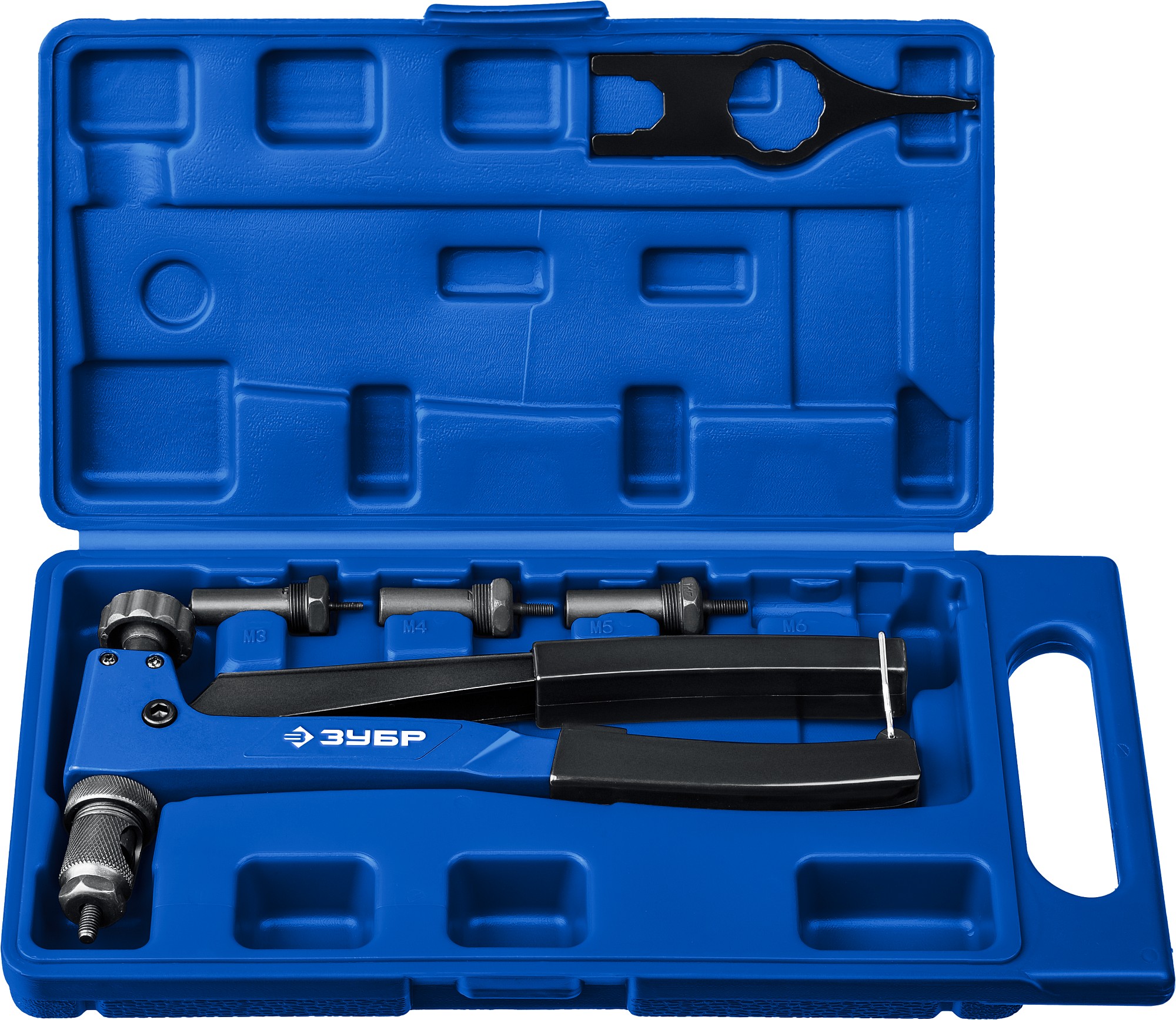 Применяется для установки стальных и алюминиевых резьбовых заклепок. Способ применения 1. Разожмите рукоятки и установите насадку и резьбовой стержень требуемого диаметра. Для замены резьбового стержня необходимо вытолкнуть штифт через боковое отверстие в головке. 2. Накрутите заклепку на стержень до упора, рукоятки при этом должны быть полностью разжаты. При необходимости ослабьте гайку и отрегулируйте ход вращением корпуса головки. 3. Вставьте заклепку в отверстие и сожмите рукоятки. 4. Выкрутите стержень из заклепки, вращая рукоять против часовой стрелки. Заклепка установлена, когда образовался бортик. Дальнейшее вытягивание приводит к поломке насадок.