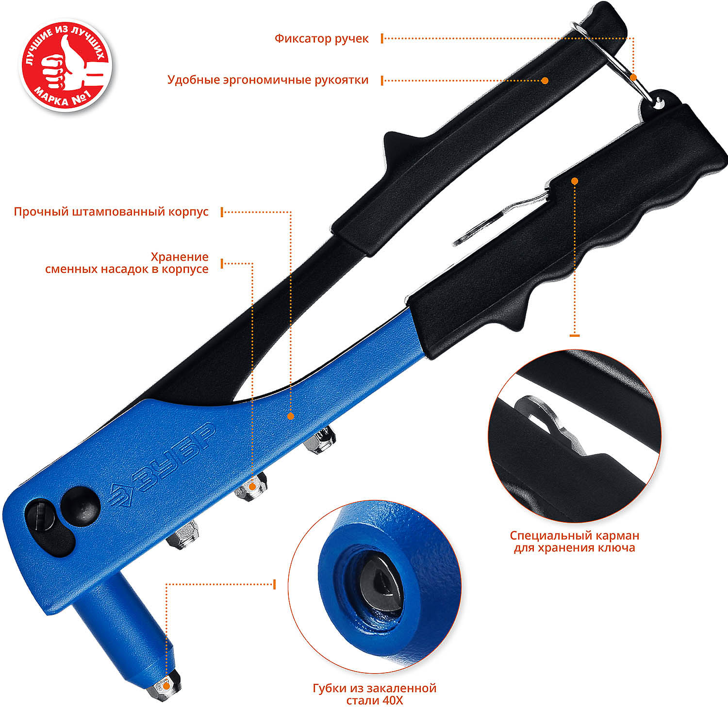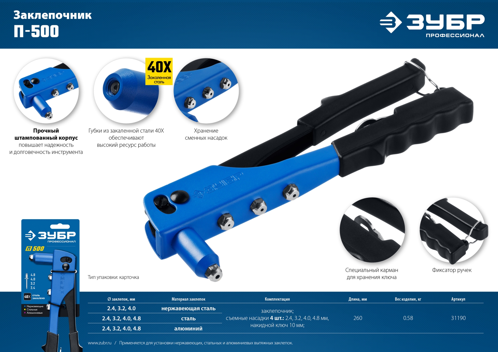 Применяется для установки вытяжных заклепок. Используется с алюминиевыми и стальными заклепками диаметром 2,4, 3,2, 4,0, 4,8 мм, нержавеющими заклепками диаметром 2,4, 3,2, 4,0 мм Способ применения: 1. Просверлите отверстие 2. Установите заклепку в заклепочник, а затем в отверстие 3. Сжимайте и разжимайте рукоятки заклепочника до момента откусывания хвостовика заклепки 4. Заклепка установлена