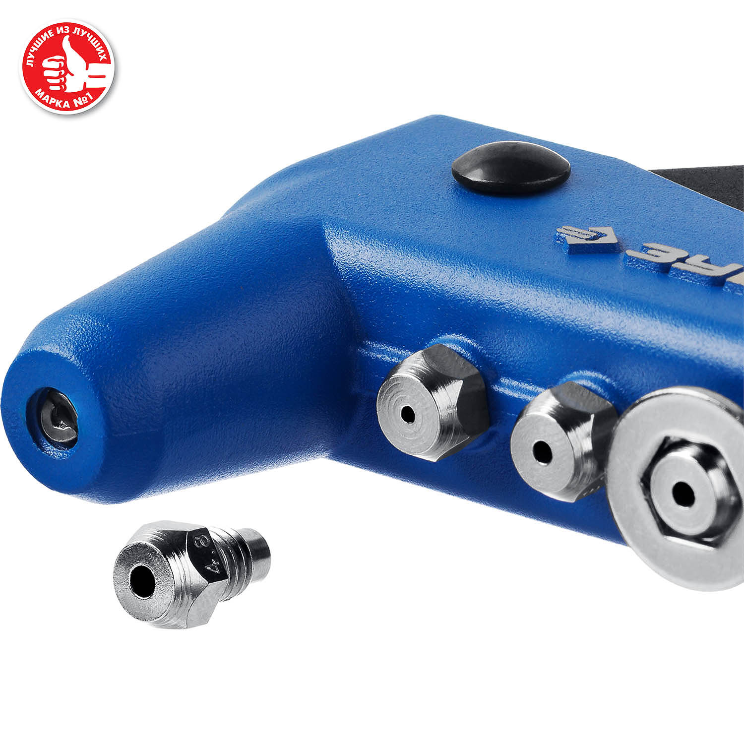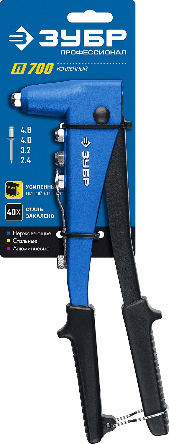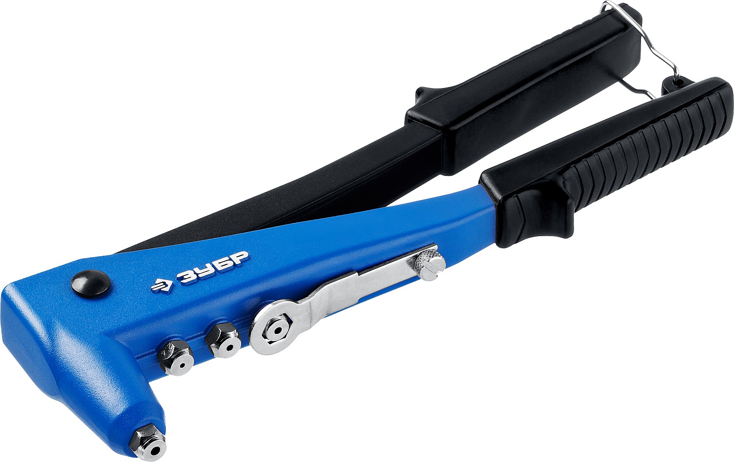 Для установки вытяжных заклепок. Используется с алюминиевыми и стальными заклепками диаметром 2,4, 3,2, 4,0, 4,8 мм, нержавеющими заклепками диаметром 2,4, 3,2, 4,0 мм Способ применения: 1. Просверлите отверстие 2. Установите заклепку в заклепочник 3. Сжимайте рукоятки заклепочника до момента откусывания хвостовика заклепки 4. Заклепка установлена