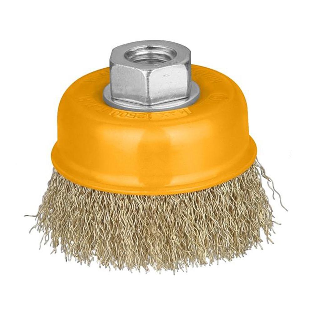 Щетка проволочная чашечная М14 100х0,3мм INGCO WB11001 применяется совместно с угловыми шлифовальными машинами и предназначена для снятия лака, краски, зачистки от ржавчины металлических поверхностей и изделий.
