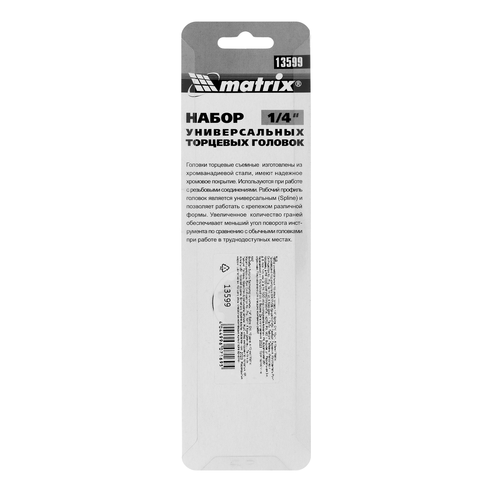 Набор универсальных торцевых головок Matrix 13599 состоит из 10 насадок размером 4-13 мм, из стали CrV, с посадочным гнездом 1/4" и 12-гранным профилем Spline. Комплект включает головки популярных размеров и используется для слесарно-монтажных работ в бытовой и профессиональной сферах.ПреимуществаУниверсальность — рабочий профиль Spline подходит для работы с любым типом крепежа.Прочность и долговечность — насадки из хромованадиевой стали выдерживают интенсивные нагрузки и устойчивы к износу.Защита от разрушения — полированное хромоникелевое покрытие предотвращает образование коррозии.Быстрый поиск нужной торцевой головки — на корпусах насадок имеются красные полоски и маркировка с обозначением размера.Удобное хранение — благодаря металлической планке-держателю торцевые головки всегда будут под рукой и не потеряются.