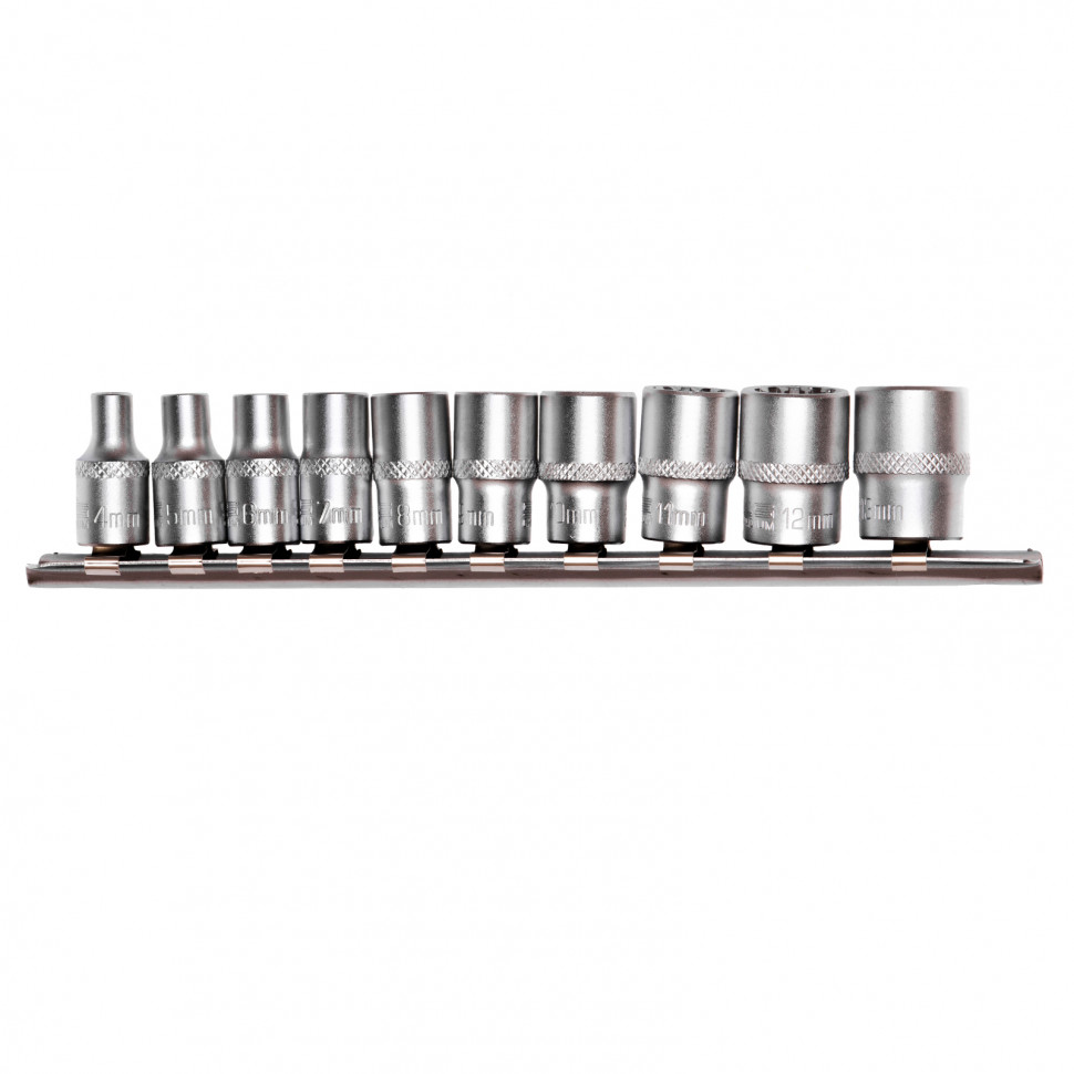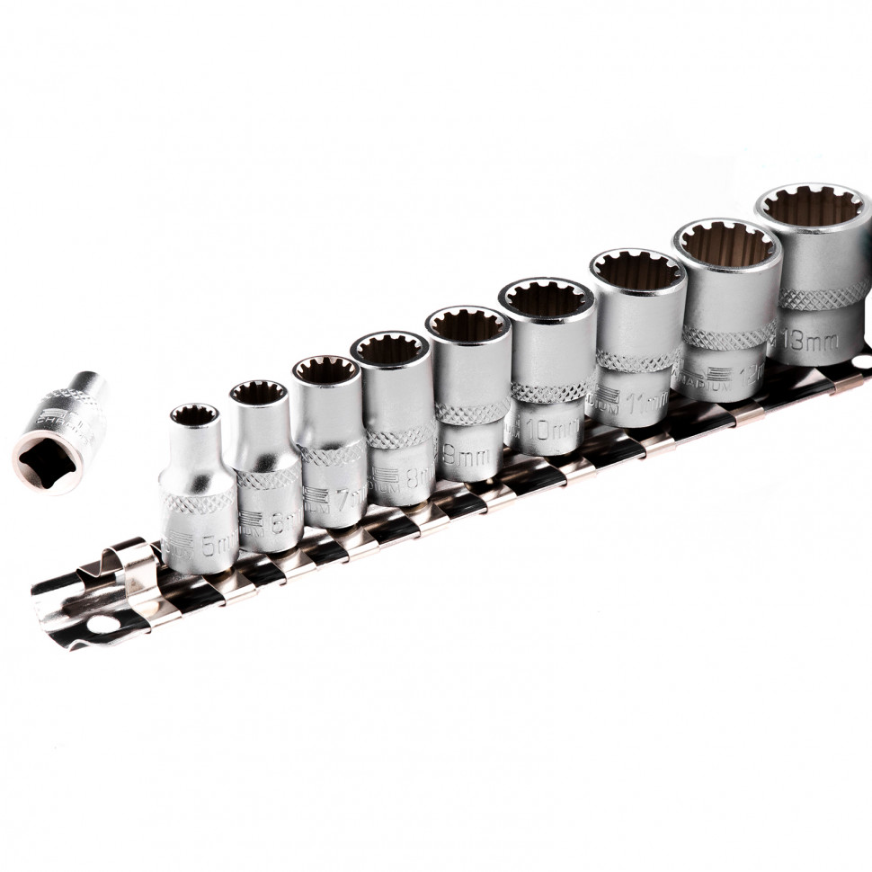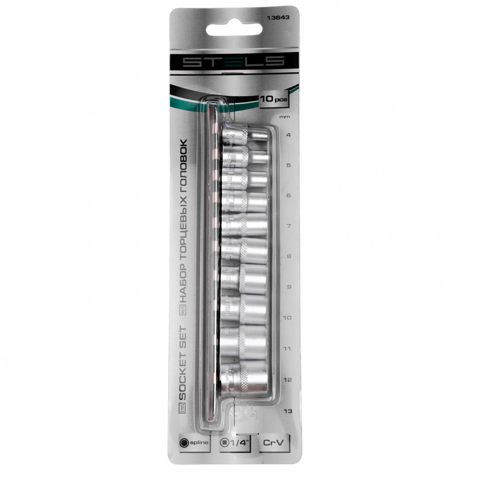 Набор универсальных торцевых головок Spline Stels 13643 под квадрат 1/4 дюйма, из стали CrV, размером 4-13 мм, 10 шт. в уп., применяется для закручивания и откручивания крепежных элементов любого типа. Набор пригодится автолюбителям для ремонта авто в гараже и в дальних поездках. Торцевые головки с профилем SPLINE подходят для работы с 12, 6, 4 и 3-гранным крепежом.ПреимуществаДеформационная стойкость и высокий ресурс — головки выполнены из прочной стали хромованадиевой группы.Антикоррозийная защита — головки имеют полированное хромоникелевое покрытие.Удобная транспортировка и хранение — в комплект входит металлическая плашка-держатель.
