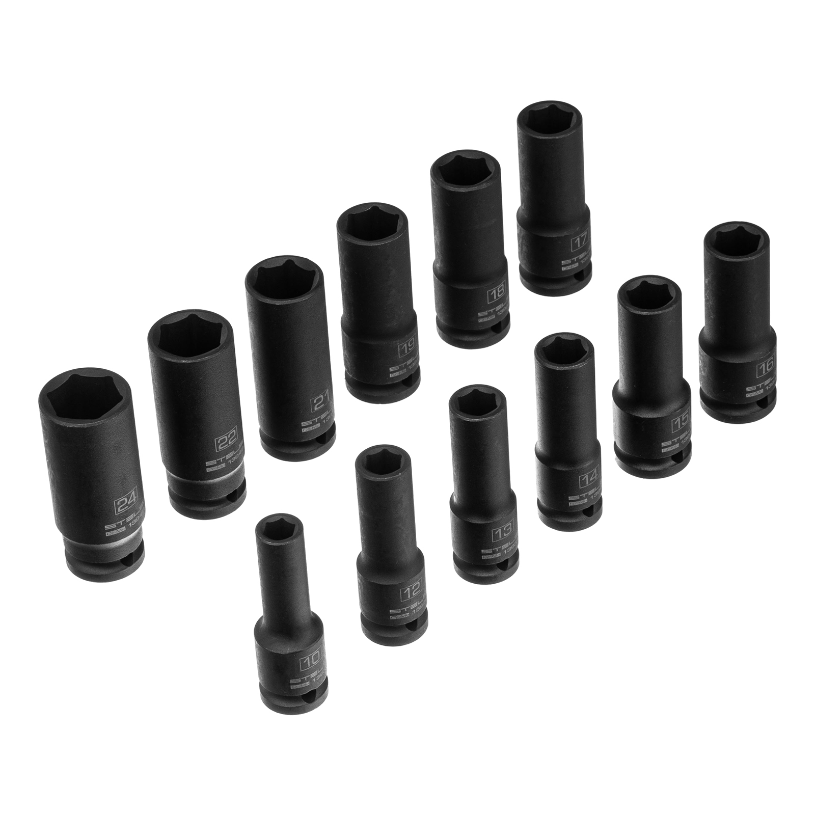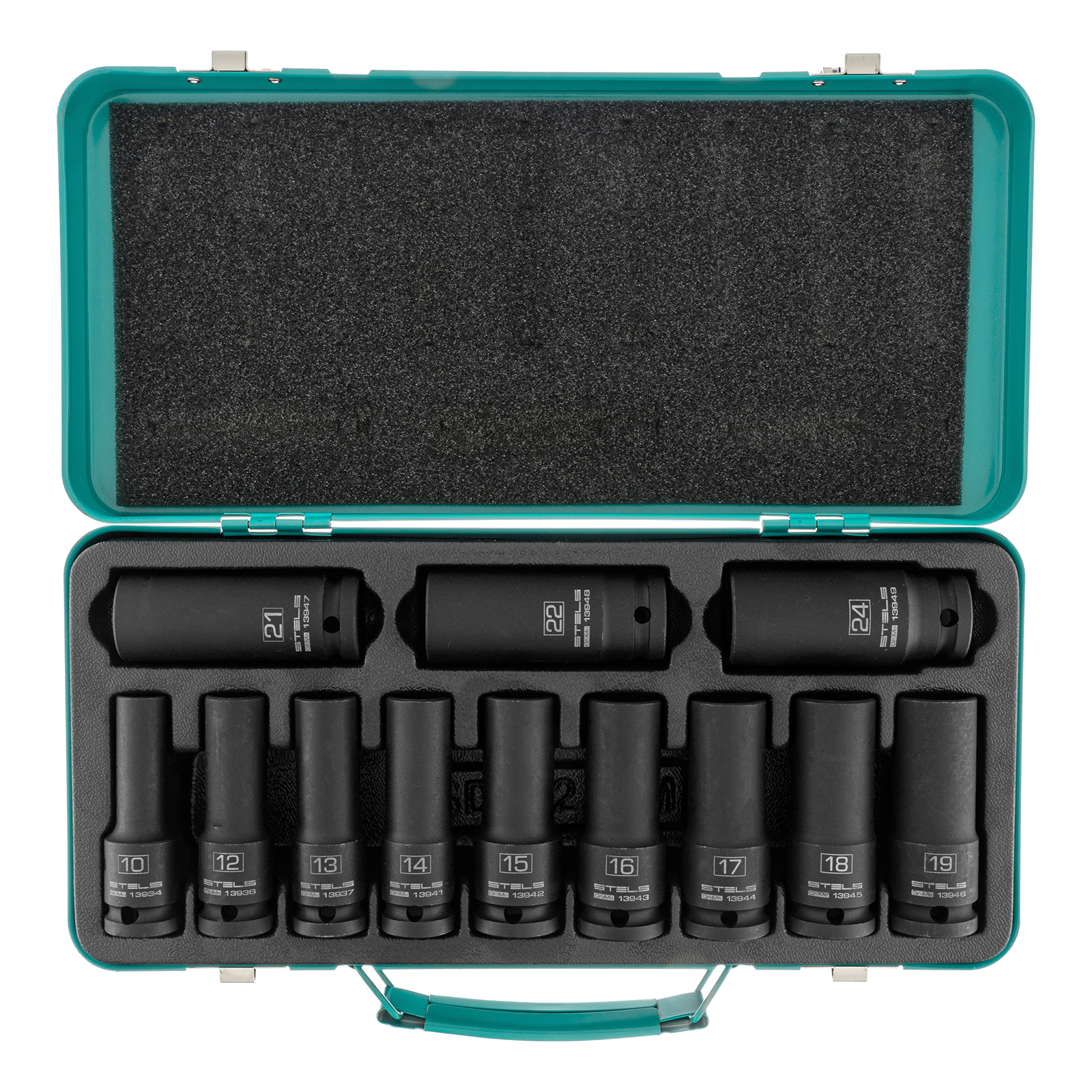 Набор ударных глубоких шестигранных торцевых головок Stels 13998 включает в себя 12 насадок размером 10-24 мм с присоединительным квадратом 1/2 дюйма. Ударные головки устанавливаются на гайковерт и выдерживают высокие динамические нагрузки, поэтому подходят для проведения строительных работ и обслуживания автомобилей.ПреимуществаУдлиненный профиль — головки удобны для работы в труднодоступных местах и для монтажа метизов на шпильках.Повышенная износостойкость — головки изготовлены из хромомолибденовой стали, твердость рабочих частей составляет 44-48 HRC.Защита от разрушения — матовое фосфатное покрытие предотвращает образование коррозии.Удобство хранения и транспортировки — набор поставляется в прочном кейсе.