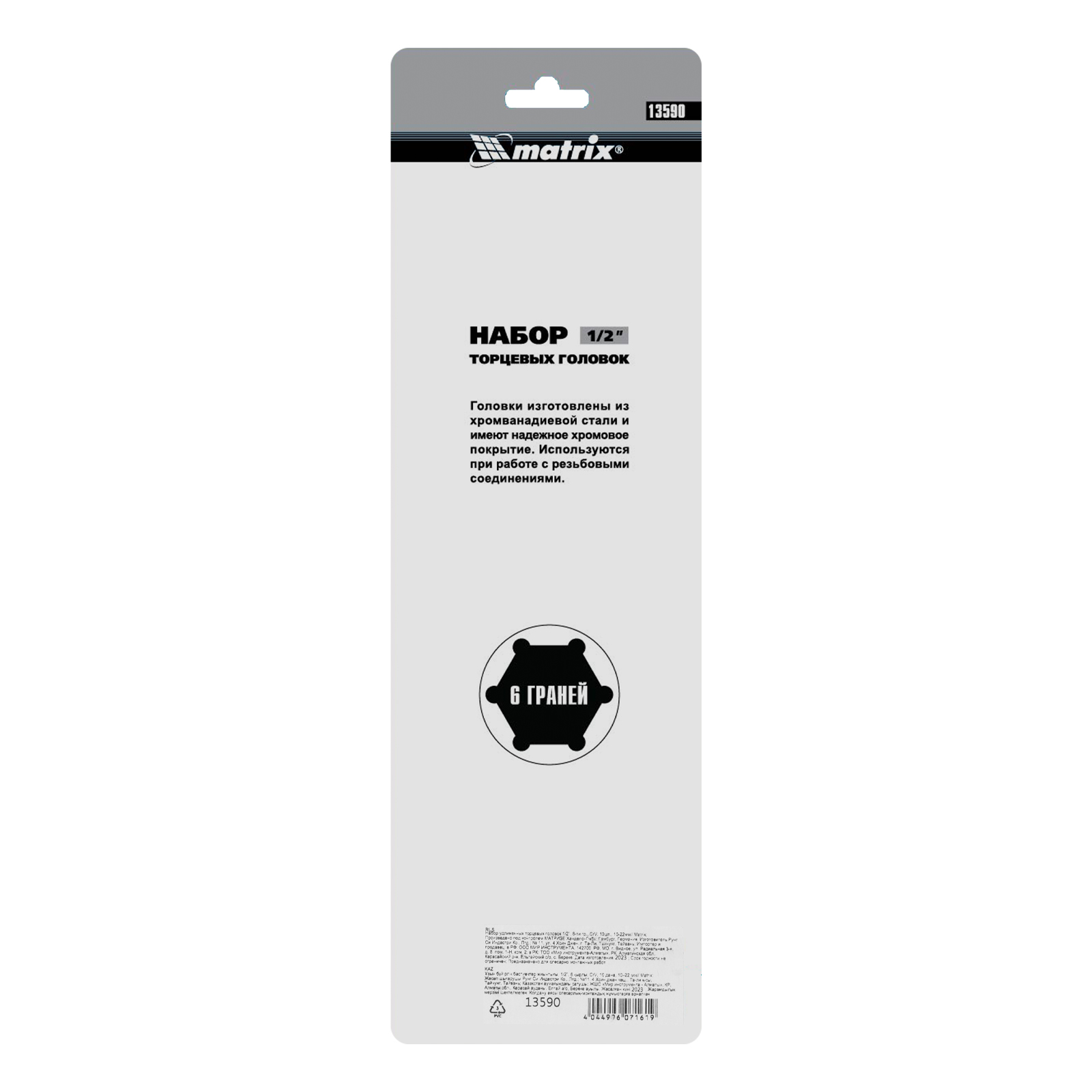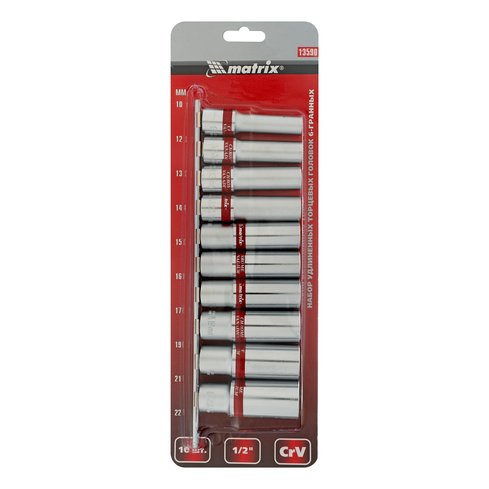 Набор удлиненных торцевых головок Matrix 13590 включает в себя 10 шестигранных насадок 10-22 мм, из стали CrV, с присоединительным квадратом 1/2", предназначенных для работы с резьбовыми соединениями. Торцевые головки с увеличенной длиной применяются для закручивания и откручивания крепежа в труднодоступных местах, а также для извлечения свечей зажигания. Набор востребован у автослесарей, сантехников, а также будет полезен в бытовой сфере.ПреимуществаНадежность — торцевые головки из высокопрочной хромованадиевой стали выдерживают значительные нагрузки.Устойчивость к износу и коррозии — насадки имеют полированное хромоникелевое покрытие.Быстрый поиск нужной насадки — торцевые головки маркированы ярко-красными полосками.Удобное хранение — в комплект поставки входит специальная планка-держатель.
