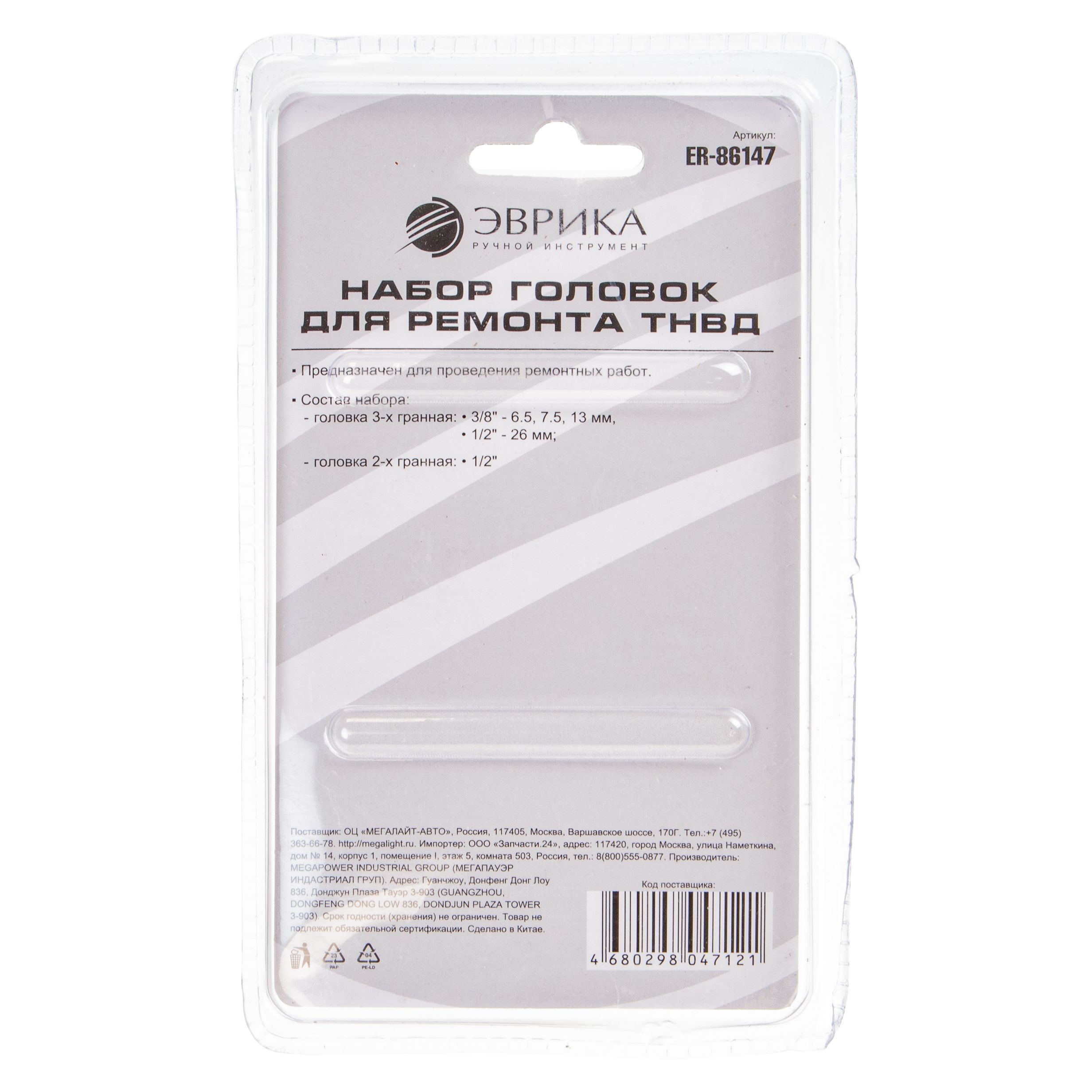 Набор головок ER-86147 для ремонта ТНВД(головка 3-х гранная: 3/8"-6.5, 7.5, 13мм, 1/2"-26мм; головка 2-х гранная 1/2"), в блистере ЭВРИКА.