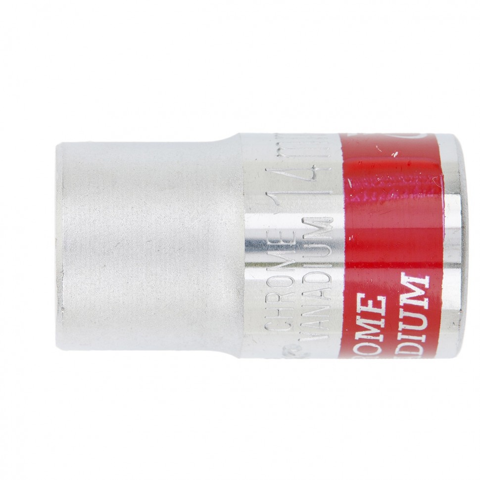 Хромированная торцевая головка Matrix 13114 из стали CrV, размером 14 мм, с 6-гранным профилем и посадочным квадратом 1/2"" — оснастка для слесарного инструмента, предназначенная для монтажа и демонтажа резьбовых соединений. Динамический шестигранный профиль обеспечивает максимальный контакт с головкой крепежа, что уменьшает ее деформацию при высоких нагрузках. Насадка пригодится для проведения монтажных и ремонтных работ дома, на даче или в гараже.ПреимуществаПрочность — оснастка выполнена из хромованадиевой стали, а твердость ее рабочей части составляет 42 HRC.Защита от разрушения — полированное хромоникелевое покрытие предохраняет торцевую головку от образования коррозии.Быстрый поиск насадки среди других инструментов — торцевая головка маркирована красной полосой, на корпус нанесено обозначение типоразмера.