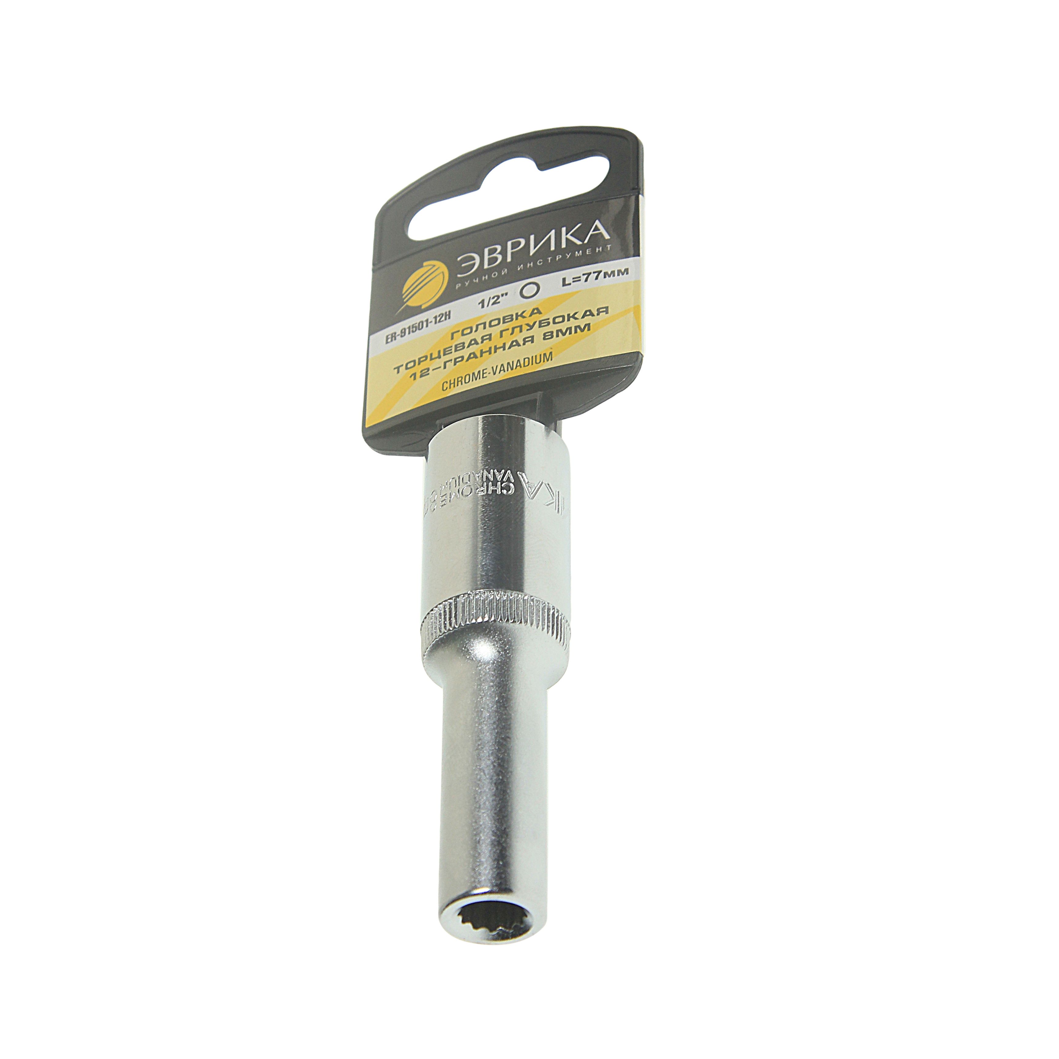 Головка торцевая 8мм 1/2" 12-гранная глубокая L-80мм(с держателем) ЭВРИКА ER-91501-12H