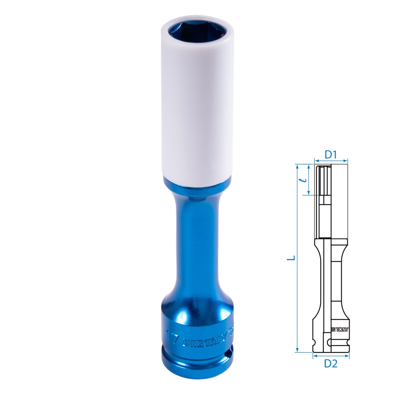 Торцевые головки изготовлены специально для работы на шиномонтажном участке. Тонкие стенки позволяют работать с крепежом легкосплавных и кованых колёсных дисков, где использование стандартных головок проблематично или недопустимо. Съёмная пластиковая втулка поможет защитить колёсный диск от возможных повреждений.